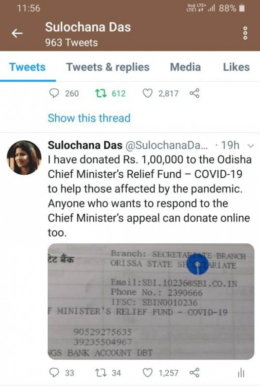 ଭୁବନେଶ୍ୱର (ଶାସକ ପ୍ରଶାସକ) କରୋନା ଆତଙ୍କ ଏବେ ସମଗ୍ର ବିଶ୍ୱକୁ କବଳିତ କରିଥିବା ବେଳେ ଓଡିଶା ସରକାର କରୋନାର ମୁକାବିଲା କରିବା ପାଇଁ ବ୍ୟାପକ ଯୁଦ୍ଧକାଳୀନ ପଦକ୍ଷେପ ଗ୍ରହଣ କରିଛନ୍ତି | କରୋନା ମହାମାରୀର ମୁକାବିଲା କରିବା ପାଇଁ ବିପୁଳ ଅର୍ଥର ଆବଶ୍ୟକତା ଥିବା ବେଲେ ଏଥିପାଇଁ ସହଯୋଗର ହାତ ବଢ଼ାଇବା ପାଇଁ ଓଡ଼ିଶାର ମୁଖ୍ୟମନ୍ତ୍ରୀ ନବୀନ ପଟ୍ଟନାୟକ ନିଜେ ନିଜ ତିନି ମାସର ଦରମା ସିଏମ ରିଲିଫ ଫଣ୍ଡକୁ ଦାନ କରିବା ସହ ଲୋକମାନଙ୍କଠାରୁ ସହାୟତା ପାଇଁ ନିବେଦନ କରିଛନ୍ତି | ମୁଖ୍ୟମନ୍ତ୍ରୀଙ୍କ ଆହ୍ୱାନ କ୍ରମର ବିଭିନ୍ନ ମହଲରୁ ସହାୟତା ଆସିବା ଆରମ୍ଭ ହୋଇଥିବା ବେଳେ ଓଡିଶା ରାଜ୍ୟ ଭିନ୍ନକ୍ଷମ ଆୟୁକ୍ତ ସୁଲୋଚନା ଦାସ ବ୍ୟକ୍ତିଗତ ଭାବେ ମୁଖ୍ୟମନ୍ତ୍ରୀଙ୍କ ରିଲିଫ ପାଣ୍ଠିକୁ ୧ଲକ୍ଷ ଟଙ୍କା ଦାନ କରିଛନ୍ତି | ଏହା ସହିତ ରାଜ୍ୟ ସରକାରଙ୍କ ପକ୍ଷରୁ ଚାଲିଥିବା କରୋନା ବିରୋଧୀ ଲଢେଇରେ ସାମିଲ ହେବା ସହ କରୋନା ପ୍ରପୀଡିତଙ୍କ ସହାୟତା ପାଇଁ ଅଧିକରୁ ଅଧିକ ସହୃଦୟ ବ୍ୟକ୍ତି ବିଶେଷ ଓ ଅନୁଷ୍ଠାନ ଆଗେଇ ଆସିବା ପାଇଁ ଶ୍ରୀମତୀ ଦାସ ଅନୁରୋଧ କରିଛନ୍ତି |