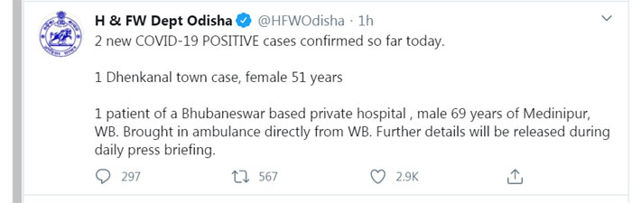 ଭୁନନେଶ୍ୱର (ଶାସକ ପ୍ରଶାସକ) ଆଉ ଦୁଇ କରୋନା ପଜିଟିଭ ଚିହ୍ନଟ ହୋଇଛନ୍ତି ରାଜ୍ୟରେ | ଜଣେ କରୋନା ପଜିଟିଭ ଢେଙ୍କାନାଳରୁ ଚିହ୍ନଟ ହୋଇଥିବା ବେଳେ ଆର ଜଣକ ରାଜଧାନୀରୁ | ଢେଙ୍କାନାଳରୁ ଚିହ୍ନଟ ହୋଇଥିବା କରୋନା ପଜିଟିଭଙ୍କ ବୟସ ୫୧ ହୋଇଥିବା ବେଳେ ଆଉ ସବିଶେଷ ତଥ୍ୟ ଦିଆଯାଇନାହିଁ | ଭୁବନେଶ୍ୱରର ରୋଗୀ ଜଣକ ମେଦିନୀପୁରର ଓ ତାଙ୍କ ବୟସ ୬୯ ବର୍ଷ | ସେ ଆମ୍ବୁଲାନ୍ସ ମାଧ୍ୟମରେ ପଶ୍ଚିମବଙ୍ଗରୁ ଆସି ସିଧା ସଳଖ ଏକ ଘରୋଇ ମେଡିକାଲରେ ଭର୍ତ୍ତି ହୋଇଥିଲେ |