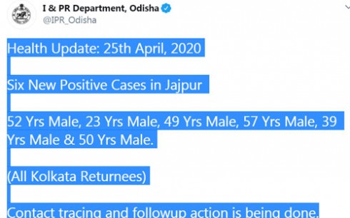 ଭୁବନେଶ୍ୱର(ଶାସକ ପ୍ରଶାସକ) ଯାଜପୁରରେ ପୁଣି ୬ କରୋନା ପଜିଟିଭ ଚିହ୍ନଟ ହେବ ସହ କରୋନା ଓଡିଶା ମାଟିରେ ସେଞ୍ଚୁରୀ ମାରିଛି । ଅର୍ଥାତ ଆକ୍ରାନ୍ତଙ୍କ ସଂଖ୍ୟା ୧୦୦ରେ ପହଂଚି ଯାଇଛି | ଏମାନଙ୍କ ବୟସ ଯଥାକ୍ରମେ ୫୨, ୨୩, ୪୯, ୫୭ , ୩୯ ଓ ୫୦ ବର୍ଷ | ଏମାନେ ସମସ୍ତେ ପଶ୍ଚିମବଙ୍ଗ/ କୋଲକାତା ଫେରନ୍ତା |