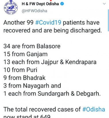 ସୁସ୍ଥ ହୋଇଥିବା ବ୍ୟକ୍ତିଙ୍କ ମଧ୍ୟରେ ବାଲେଶ୍ୱରରୁ ୩୪, ଭଦ୍ରକରୁ ୯, ଦେବଗଡ ରୁ ୧, ଗଂଜାମରୁ ୧୫, ଯାଜପୁରରୁ ୧୩, କେନ୍ଦ୍ରାପଡ଼ାରୁ ୧୩, ନୟାଗଡରୁ ୩ଜଣ, ପୁରୀରୁ ୧୦ ଜଣ, ସୁନ୍ଦରଗଡରୁ ଜଣେ ସୁସ୍ଥ ହୋଇଥିବା ଜଣାପଡିଛି |
