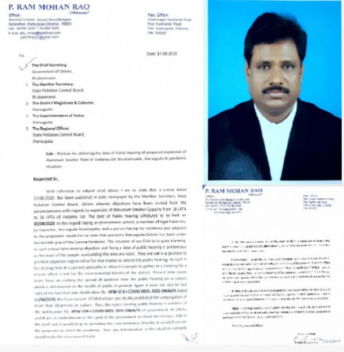 ଗତ ୨୭/୦୮/୨୦୨୦ ତାରିଖରେ ରାଜ୍ୟ ପ୍ରଦୂଷଣ ନିୟନ୍ତ୍ରଣ ବୋର୍ଡ଼ର ସଚିବ ସମ୍ବାଦପତ୍ର ମାନଙ୍କରେ ଏକ ବିଜ୍ଞପ୍ତି ପ୍ରକାଶ କରିଥିଲେ। ବେଦାନ୍ତ ନିଜର ସ୍ମେଲଟର ପ୍ଲାଣ୍ଟର କ୍ଷମତାକୁ ୧୬ ଏଲପିଟିଏରୁ ୧୮ ଏଲପିଟିଏକୁ ବୃଦ୍ଧି କରିବାକୁ ଚାହୁଁଥିବା ପାଇଁ ଦେଇଥିବା ଆବେଦନ ଉପରେ ଲୋକଙ୍କ ମତାମତ ପାଇଁ ଆସନ୍ତା ୩୦/୦୯/୨୦୨୦ରେ ଏ ଜନଶୁଣାଣି କାର୍ଯ୍ୟକ୍ରମର ଆୟୋଜନ କରାଯିବ ବୋଲି ଏହି ବିଜ୍ଞପ୍ତିରେ ସୂଚନା କରାଯାଇଥିଲା। ମାତ୍ର ବର୍ତ୍ତମାନ ଝାରସୁଗୁଡ଼ା ଜିଲ୍ଲା କୋରୋନା ମହାମାରୀର ଭୟଙ୍କର ପରିସ୍ଥିତି ଦେଇ ଗତି କରୁଥିବା ବେଳେ ଏହିପରି ଜନଶୁଣାଣି ବ୍ୟବସ୍ଥା କରିବା ଉଚିତ୍ ହେବ ନାହିଁ ବୋଲି ଏହି ପତ୍ରରେ ଶ୍ରୀ ରାଓ ଉଲ୍ଲେଖ କରିଛନ୍ତି। ଏହିପରି ସମୟରେ ଜନଶୁଣାଣି କରିବା ଲୋକଙ୍କ ସହିତ ଛଳନା ଅଟେ କାରଣ ଲୋକେ କୋଭିଡ କଟକଣା ପାଇଁ ଶୁଣାଣି ସ୍ଥାନରେ ଠୁଳ ହୋଇପାରିବେ ନାହିଁ ବୋଲି ଶ୍ରୀ ରାଓ ମତ ପ୍ରକାଶ କରିଛନ୍ତି। ଲୋକମାନେ ଏପରି ଏକ ଜନଶୁଣାଣି କାର୍ଯ୍ୟକ୍ରମରେ ଯୋଗ ଦେବା ଭଳି ପରିସ୍ଥିତିରେ ନ ଥିବା ବେଳେ ସମଗ୍ର ଜିଲ୍ଲାକୁ କୁପ୍ରଭାବ ପକାଉଥିବା ପରିବେଶ ସମ୍ପର୍କିତ ଏଭଳି ଏକ ଗୁରୁତ୍ବପୂର୍ଣ୍ଣ ବିଷୟରେ ଲୋକଙ୍କୁ ଏକତ୍ର ହେବା ପାଇଁ ବିଜ୍ଞପ୍ତି ପ୍ରକାଶ କରିବା ଆଦୌ ସମୀଚୀନ ନୁହେଁ ବୋଲି ସେ ପତ୍ରରେ ଦର୍ଶାଇଛନ୍ତି। ବର୍ତ୍ତମାନ ସମୟରେ ସ୍ମେଲଟର ପ୍ଲାଣ୍ଟର କ୍ଷମତା ବୃଦ୍ଧି ନୁହେଁ ବରଂ ସରକାର ମହାମାରୀ ବିରୁଦ୍ଧରେ ଧ୍ୟାନ ଦେବା ବେଶୀ ଗୁରୁତ୍ବପୂର୍ଣ୍ଣ ବୋଲି ଆବେଦନକାରୀ ଶ୍ରୀ ରାଓ କହିଛନ୍ତି। ଏତଦବ୍ୟତୀତ ଓଡ଼ିଶା ସରକାରଙ୍କ ତା:31/08/2020 ର Vide Notification Number HFW-SCH-1- COVID-0025-2020-19646/H