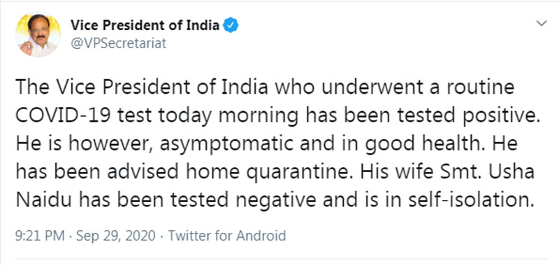 ନୂଆଦିଲ୍ଲୀ (ଶାସକ ପ୍ରଶାସକ ) ଭାରତର ଉପରାଷ୍ଟ୍ରପତି ଏମ ଭେଙ୍କେୟା ନାଇଡୁ କୋଭିଡ ପଜିଟିଭ୍ ଚିହ୍ନଟ ହୋଇଛନ୍ତି | ଖୋଦ ଉପରାଷ୍ଟ୍ରପତିଙ୍କ ଟ୍ୱିଟର ହ୍ୟାଣ୍ଡେଲରେ ଏହା ସୂଚନା ଦିଆଯାଇଛି। ଆଜି ସକାଳେ ରୁଟିନ୍ COVID-19 ପରୀକ୍ଷା ବେଳେ ଶ୍ରୀ ନାଇଡୁ ପଜିଟିଭ୍ ହୋଇଥିବା କୁହାଯାଇଛି । ସେ କିନ୍ତୁ ଲକ୍ଷଣ ବିହୀନ ଓ ସୁସ୍ଥ ଅଛନ୍ତି। ତାଙ୍କୁ ଘରେ କ୍ଵାରେଣ୍ଟାଇନରେ ରହିବା ପାଇଁ ପରାମର୍ଶ ଦିଆଯାଇଛି। ଅପରପକ୍ଷରେ ଉପରାଷ୍ଟ୍ରପତିଂକ ଧର୍ମପତ୍ନୀ ଶ୍ରୀମତୀ ଉଷା ନାଇଡୁଙ୍କୁ କୋଭିଡ ନେଗେଟିଭ ଚିହ୍ନଟ ହୋଇଛନ୍ତି ଏବଂ ସେ ଆତ୍ମ ସଙ୍ଗରୋଧରେ ଅଛନ୍ତି |