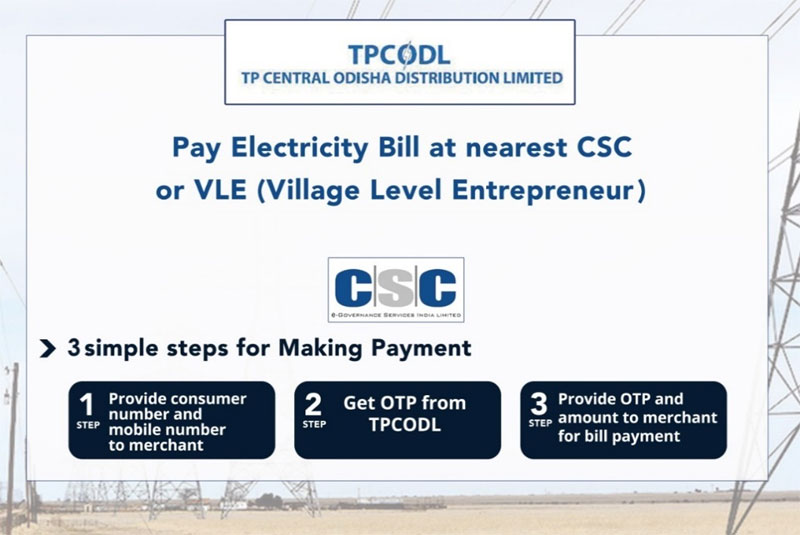ଗ୍ରାମାଚଂଳରେ ଡିଜିଟାଲ୍ ପେମେଂଟରେ ଉନ୍ନତିି ଆଣିବା ସନ୍ଧାନରେ ଟିପିସିଓଡିଏଲ୍ ପକ୍ଷରୁ ଜନ ସେବା କେନ୍ଦ୍ର (ସିଏସସି) କିମ୍ବା ଗ୍ରାମୀଣ ସ୍ତରୀୟ ଉଦ୍ୟୋଗୀ (ଭିଏଲ୍ଇ)ଙ୍କ ଜରିଆରେ ବିଦ୍ୟୁତ ବିଲ୍ ଗ୍ରହଣ କରିବା ଲାଗି ସିଏସ୍ସି ଇ-ଗଭର୍ଣ୍ଣାସ୍ ସର୍ଭିସେସ୍ ଇଣ୍ଡିଆ ଲିମିଟେଡ୍ ସହିତ ସହଯୋଗିତା ସ୍ଥାପନ କରିଛି । ଟିପିସିଓଡିଏଲ୍ ଅଂଚଳରେ ପ୍ରାୟ ୫୮୦୦ରୁ ଅଧିକ ସିଏସସି/ଭିଏଲ୍ଇ ରହିଛି । ଗ୍ରାହକମାନେ ନିମ୍ନ ଚିତ୍ରରେ ପ୍ରଦାନ କରାଯାଇଥିବା ୩ଯି ସହର ଉପାୟରେ ନିକଟତମ ସିଏସସି କିମ୍ବା ଭିଏଲ୍ଇ ପରିଦର୍ଶନ କରି ବିଦ୍ୟୁତ ବିଲ୍ ପଇଠ କରିପାରିବେ ।