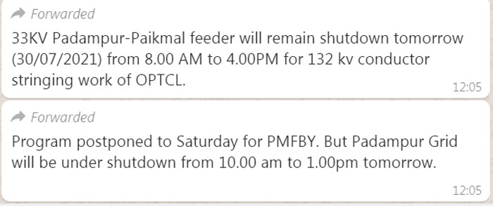 କିନ୍ତୁ ଆଜି ପୁଣି ଯଥା ସମୟରେ ବିଦ୍ୟୁତ କାଟ ହୋଇଛି। ବିଦ୍ୟୁତ ବିଭାଗ କୁ ଯୋଗାଯୋଗ କଲେ କହୁଛନ୍ତି ଆମେ ସିନା ଲାଇନ କାଟିବୁ ନାହିଁ | ହେଲେ ପଦ୍ମପୁର ତ ଲାଇନ କାଟିଛନ୍ତି। ପଦ୍ମପୁର ରେ କଣ ଚାଷିବୀମା କଣ କରିବେନାହିଁ।