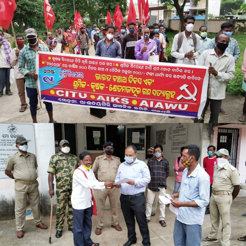 ଏହି ପରିପେକ୍ଷୀରେ ସଂଘ ୧୨ ଗୋଟି ଦାବୀ ଯଥା - ଶ୍ରମିକ ବିରୋଧି ୪ଟି ଶ୍ରମକୋର୍ଡ଼ , କୃଷକ ବିରୋଧି ୩ଟି କୃଷି ଆଇନ ଓ ବିଦ୍ୟୁତ ଘରୋଇକରଣ ବିଲ ବାତିଲ , ଏମ୍.ଏସ୍ ସ୍ୱାମୀନାଥନ କମିଶନ୍ ସୁପାରିଶ ଅନୁଯାୟୀ ସମସ୍ତ କୃଷିଜାତ ଦ୍ରବ୍ୟ ଗୁଡିକର ସର୍ବନିମ୍ନ ସହାୟକ ମୂଲ୍ୟ ପ୍ରଦାନ ପାଇଁ ଆଇନ ପ୍ରଣୟନ , ସମସ୍ତ ଲୋକଙ୍କୁ ମାଗଣାରେ କୋଭିଡ ଟୀକା ଡିସେମ୍ବର ୨୦୨୧ ସୁଦ୍ଧା ଦେବାର ବ୍ୟବସ୍ଥା କରିବା , ଆୟକର ଦେଉନଥିବା ପ୍ରତ୍ୟେକ ପରିବାରକୁ ମାସକୁ ୭ ହଜାର ୫ ଶହ ଟଙ୍କା ଓ ମୁଣ୍ଡପିଛା ୧୦ କିଲୋ ଚାଉଳ ୬ମାସ ପାଇଁ ଦିଆଯିବା , ସରକାରୀ ଉଦ୍ୟୋଗର ଘରୋଇକରଣ ବନ୍ଦ କରିବା , କୋଭିଡ୍ ସମୟରେ କାମ କରୁଥିବା ସବୁ କ୍ଷେତ୍ରରେ (ସରକାରୀ ଓ ବେସରକାରୀ) ନିୟୁକ୍ତି ଶ୍ରମିକମାନଙ୍କୁ କୋଭିଡ୍ ଯୋଦ୍ଧା ଭାବେ ଘୋଷଣା କରିବା ଓ ସେମାନଙ୍କୁ ୫୦ ଲକ୍ଷ ଟଙ୍କାର ସହାୟତା ରାଶି ପ୍ରଦାନ କରିବା , ଭାଗଚାଷୀ ମାନଙ୍କୁ ଚାଷୀର ମାନ୍ୟତା ଓ ଭାଗଚାଷୀ ମାନଙ୍କୁ ଚାଷୀର ଅଧିକାର ପ୍ରଦାନ କରିବା , ମନରେଗାରେ ବର୍ଷକୁ ୨୦୦ ଦିନର କାମ ଓ ଦୈନିକ ମଜୁରୀ ୬ ଶହ ଟଙ୍କା କରିବା ଓ ମଜୁରୀ ପ୍ରଦାନ କ୍ଷେତ୍ରରେ ଆଦିବାସୀ ଓ ଦଳିତ ମାନଙ୍କୁ ଭିନ୍ନ ପର୍ଯ୍ୟାୟଭୁକ୍ତ କରାନଯାଉ , ଓଡ଼ିଶାର ଛାତ୍ର/ଛାତ୍ରୀମାନଙ୍କ ପାଠପଢ଼ା ପାଇଁ ଓଡ଼ିଶା ଦୂରଦର୍ଶନ ଚ୍ୟାନେଲ ଜରିଆରେ ସୁନିଶ୍ଚିତ ବ୍ୟବସ୍ଥା କରିବା , କୋଭିଡ୍ ରେ ମୃତ୍ୟୁବରଣ କରିଥିବା ବ୍ୟକ୍ତିଙ୍କ ସଠିକ ପଞ୍ଜିକରଣ କରି ସଂପୃକ୍ତ ପୀଡିତ ପରିବାରଙ୍କୁ ପ୍ରମାଣପତ୍ର ପ୍ରଦାନ କରିବା ଓ ପରିବାରର ସଦସ୍ୟଙ୍କୁ ୪ ଲକ୍ଷ ଟଙ୍କା ସହାୟତା ରାଶି ପ୍ରଦାନ କରିବା , ଓଡ଼ିଶାରେ ପ୍ରାକୃତିକ ବିପର୍ଯ୍ୟୟ ପରିଚାଳନା ଜନିତ କ୍ଷୟକ୍ଷତିର ଉପଯୁକ୍ତ କ୍ଷତିପୂରଣ ଆର୍ଥିକ ସହାୟତା ପ୍ରଦାନ ପାଇଁ ଜାତୀୟ ବିପର୍ଯ୍ୟୟ ପରିଚାଳନା ପାଣ୍ଠି (ଏନ୍ଡ଼ିଆରଏଫ୍)ର ନିୟମାବଳୀକୁ ଓ (ଏସ୍ଡ଼ିଆରଏଫ୍)ର ନିୟମାବଳୀକୁ ସଂଶୋଧନ କରାଯିବା ଉପରେ ବିଭିନ୍ନ ଦାବୀ ସମ୍ଵଳିତ ସ୍ମାରକପତ୍ର ଭାରତର ପ୍ରଧାନମନ୍ତ୍ରୀ ନରେନ୍ଦ୍ର ମୋଦୀଙ୍କ ନିକଟକୁ ସ୍ଥାନୀୟ ତହସିଲଦାର ସାରଦା ପ୍ରସନ୍ନ ପଣ୍ଡାଙ୍କ ଜରୀଆରେ ପଠାଇବା ପାଇଁ ଅନୁରୋଧ କରିଥିଲେ।