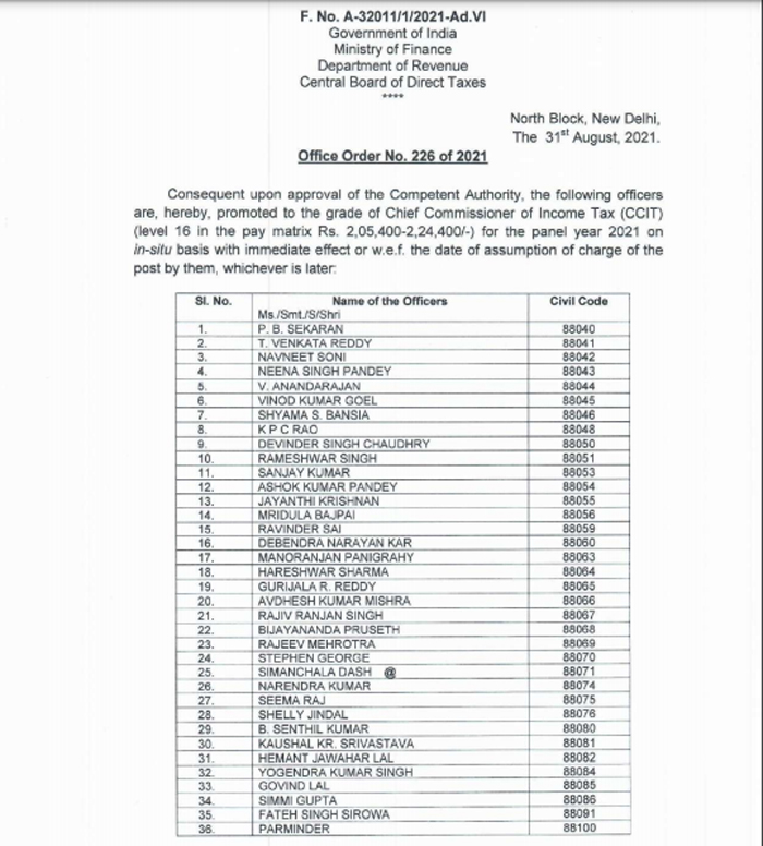 ୪ ବରିଷ୍ଠ ଆଇଆରଏସ ଅଧିକାରୀଙ୍କୁ ମୁଖ୍ୟ ଆୟକର ଆୟୁକ୍ତ ପାହ୍ୟାକୁ ପଦୋନ୍ନତି