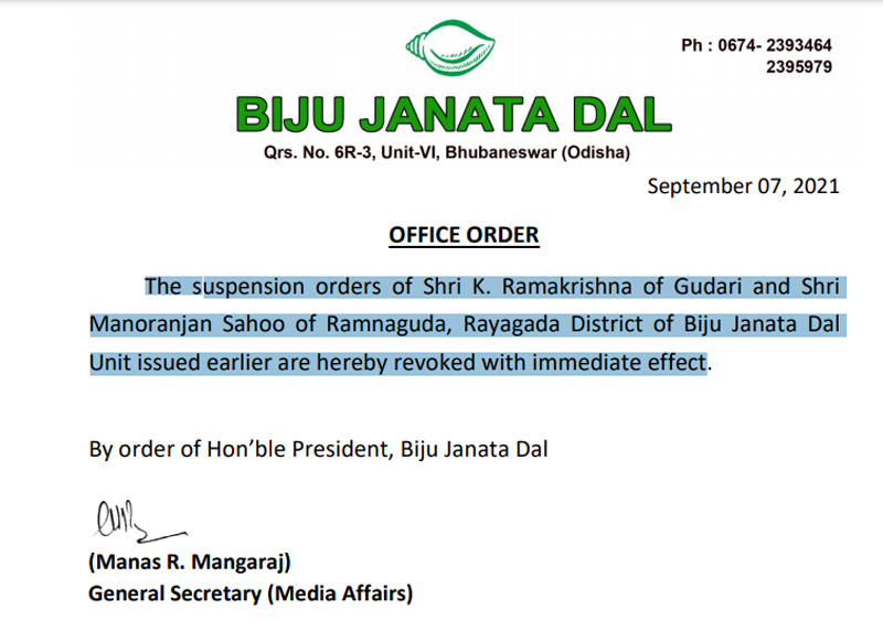 ଦୁଇ ବିଜେଡି ନେତାଙ୍କ ଉପରୁ ନିଲମ୍ବନ ଆଦେଶ ପ୍ରତ୍ୟାହୃତ