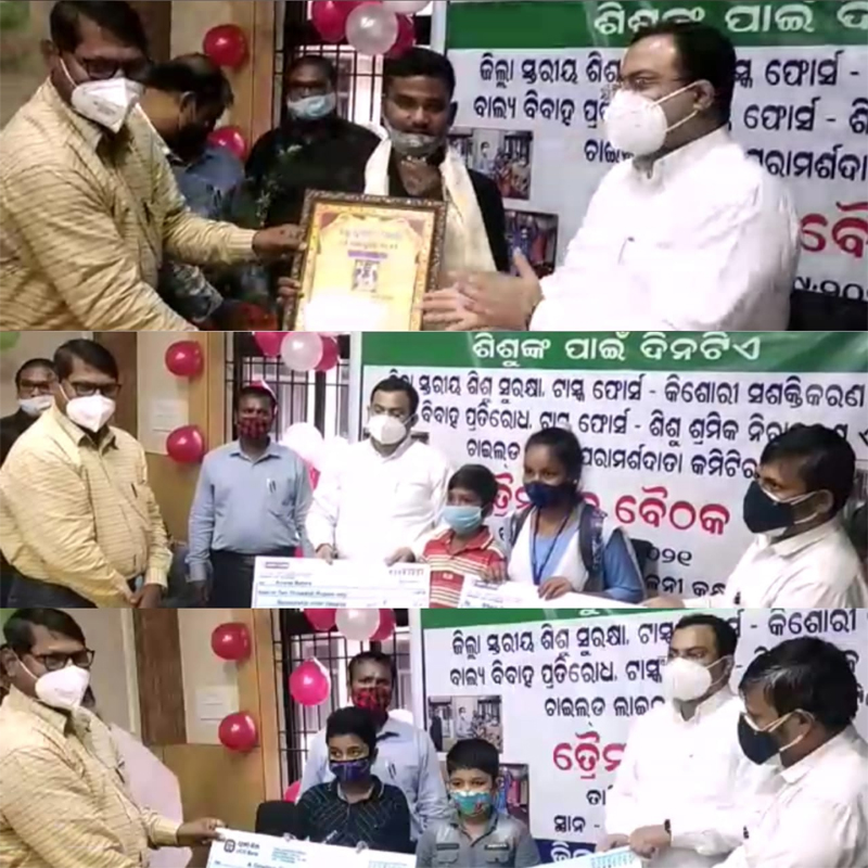 ଏହି ଅବସରରେ ମୋବାଇଲ୍ ରୋବଟ୍ ରେ ରାଜ୍ୟ ସ୍ତରୀୟ ପ୍ରତିଯୋଗିତାରେ ସ୍ବର୍ଣ୍ଣ ପଦକ ହାସଲ କରିଥିବା ଦୀପକ କୁମାର ବେଣିଆଙ୍କୁ ଜିଲ୍ଲାପାଳ ସମ୍ମାନିତ କରିଥିଲେ। ଶେଷରେ ହିତାଧିକାରୀ ଶିଶୁ ମାନଙ୍କୁ ଏହି ଅବସରରେ ଜିଲ୍ଲା ପ୍ରଶାସନର ଜିଲ୍ଲା ଶିଶୁ ସୁରକ୍ଷା ୟୁନିଟ୍ ପକ୍ଷରୁ ଆଶୀର୍ବାଦ ଓ ପୃଷ୍ଠପୋଷକତା ସହାୟତା ଯୋଜନାରେ ଚେକ୍ ବଣ୍ଟନ କରାଯାଇଥିଲା ।