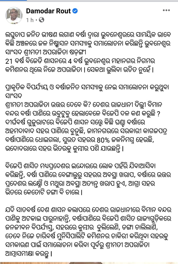 ଭୁବନେଶ୍ୱର : ଲଘୁଚାପ ଜନିତ ଭୀଷଣ ଲଗାଣ ବର୍ଷା ଦ୍ୱାରା ଭୁବନେଶ୍ୱରରେ ସାମୟିକ ଭାବେ କିଛି ଅଞ୍ଚଳରେ ଜଳ ନିଷ୍କାସନ ସମସ୍ୟାକୁ ନେଇ ବିଜେପି ନେତ୍ରୀ ତଥା ଭୁବନେଶ୍ୱର ସଂସଦ ଅପରାଜିତା ଷଡ଼ଙ୍ଗୀଙ୍କ ସମାଲୋଚନା ପରେ ତାଙ୍କୁ ଜବାବ ଦେଇଛନ୍ତି ପୂର୍ବତନମନ୍ତ୍ରୀ ଡାକ୍ତର ଦାମୋଦର ରାଉତ | ଶ୍ରୀମତୀ ଷଡ଼ଙ୍ଗୀଙ୍କ ମନ୍ତବ୍ୟ ପରିପ୍ରେକ୍ଷୀରେ ଡ ରାଉତ କହିଛନ୍ତି ଯେ " ଲଘୁଚାପ ଜନିତ ଭୀଷଣ ଲଗାଣ ବର୍ଷା ଦ୍ୱାରା ଭୁବନେଶ୍ୱରରେ ସାମୟିକ ଭାବେ କିଛି ଅଞ୍ଚଳରେ ଜଳ ନିଷ୍କାସନ ସମସ୍ୟାକୁ ସମାଲୋଚନା କରିଛନ୍ତି ଭୁବନେଶ୍ୱର ସାଂସଦ ଶ୍ରୀମତୀ ଅପରାଜିତା ଷଡ଼ଙ୍ଗୀ 21 ବର୍ଷ ବିଜେଡି ଶାସନରେ 4 ବର୍ଷ ଭୁବନେଶ୍ୱର ମହାନଗର ନିଗମର କମିଶନର ଥିଲେ ନିଜେ ଅପରାଜିତା l ସେକଥା ଭୁଲିବା ଉଚିତ ନୁହେଁ l "