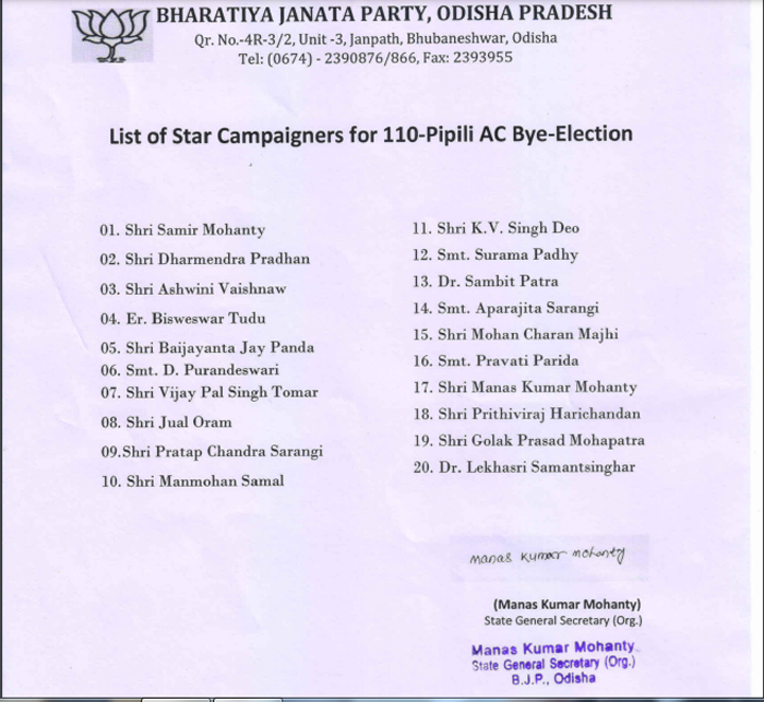 ପ୍ରକାଶ ଥାଉ କି କୋଭିଡ୍ କାରଣରୁ ପିପିଲି ନିର୍ବାଚନ ସ୍ଥଗିତ ରହିଥିଲା। ଚଳିତ ମାସ ସେପ୍ଟେମ୍ବର ୩୦ରେ ହେବାକୁ ଥିବା ଉପନିର୍ବାଚନ ନିମନ୍ତେ ମୁଖ୍ୟ ନିର୍ବାଚନ ଅଧିକାରୀ କୋଭିଡ୍ କଟକଣା କାରଣରୁ ଷ୍ଟାର୍ ପ୍ରଚାରକ କ୍ଷେତ୍ରରେ ବି କାଣ୍ଟଛାଣ୍ଟ୍ କରିଛନ୍ତି। ନିର୍ବାଚନ ଅଧିକାରୀଙ୍କ ନିର୍ଦ୍ଦେଶନାମା ଅନୁଯାୟୀ ଭାରତୀୟ ଜନତା ପାର୍ଟି ପକ୍ଷରୁ ଏକ ୨୦ ଜଣିଆ ଷ୍ଟାର୍ ପ୍ରଚାରକ ତାଲିକା ପ୍ରସ୍ତୁତ କରାଯାଇଛି। ଯେଉଁମାନେ କି ପିପିଲି ଉପ ନିର୍ବାଚନର ପ୍ରଚାର କାର୍ଯ୍ୟରେ ବିଭିନ୍ନ ସମୟରେ ପିପିଲି ଗସ୍ତ କରିବେ।