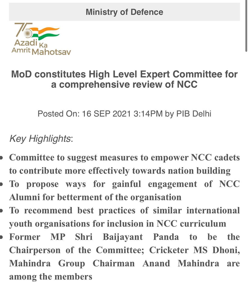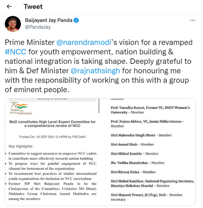 ନୂଆଦିଲ୍ଲୀ: ଜାତୀୟ ସମର ଶିକ୍ଷାର୍ଥୀ ବାହିନୀ (ଏନସିସି)କୁ ଅଧିକ ପ୍ରାସଙ୍ଗିକ ତଥା ତାହାର ଗଠନମୂଳକ ପୁନର୍ବିନ୍ୟାସ ପାଇଁ ଆବଶ୍ୟକ ସଂଶୋଧନ ଆଣିବା ଲକ୍ଷ୍ୟ ନେଇ ପ୍ରଧାନମନ୍ତ୍ରୀ ନରେନ୍ଦ୍ର ମୋଦିଙ୍କ ନେତୃତ୍ୱାଧୀନ ସରକାର ଏକ ବୃହତ ପଦକ୍ଷେପ ନେଇଛନ୍ତି। ଏହି ଉଦ୍ଦେଶ୍ୟରେ ପ୍ରତିରକ୍ଷା ମନ୍ତ୍ରଣାଳୟ ଅଧୀନରେ ଏକ ଉଚ୍ଚସ୍ତରୀୟ ବିଶେଷଜ୍ଞ କମିଟି ଗଠନ କରାଯାଇଛି | ପୂର୍ବତନ ସାଂସଦ ତଥା ବିଜେପି ରାଷ୍ଟ୍ରୀୟ ଉପାଧ୍ୟକ୍ଷ ଶ୍ରୀଯୁକ୍ତ ବୈଜୟନ୍ତ ପଣ୍ଡାଙ୍କୁ ଏହି ଉଚ୍ଚସ୍ତରୀୟ ବିଶେଷଜ୍ଞ କମିଟିର ଅଧ୍ୟକ୍ଷ ନିଯୁକ୍ତ କରିଛନ୍ତି। ଏହି କମିଟି ରାଷ୍ଟ୍ର ନିର୍ମାଣ ଦିଗରେ ଅଧିକ ପ୍ରଭାବଶାଳୀ ଯୋଗଦାନ ପାଇଁ ଏନସିସି କ୍ୟାଡେଟମାନଙ୍କୁ ସଶକ୍ତ କରିବା ସକାଶେ ପରାମର୍ଶ ଦେବା ସହ ସଂଗଠନର ଉନ୍ନତି ପାଇଁ ଏନସିସି ଆଲୁମିନିଙ୍କ ଲାଭଜନକ ଯୋଗଦାନ ପାଇଁ କମିଟି ମଧ୍ୟ ସୁପାରିଶ କରିବ । ଅନୁରୂପ ଆନ୍ତର୍ଜାତୀୟ ଯୁବ ସଂଗଠନର ସର୍ବୋତ୍ତମ ଅଭ୍ୟାସକୁ ଏନସିସି ପାଠ୍ୟକ୍ରମରେ ଅନ୍ତର୍ଭୁକ୍ତ କରିବା ପାଇଁ ଏ ଉଚ୍ଚସ୍ତରୀୟ କମିଟି ମଧ୍ୟ ସୁପାରିଶ କରିବ | ଏହି ଉଚ୍ଚସ୍ତରୀୟ କମିଟିର ଶ୍ରୀ ପଣ୍ଡା ଅଧ୍ୟକ୍ଷ ଥିବା ବେଳେ ଏହି ୧୫- ଜଣିଆ ଉଚ୍ଚ ସ୍ତରୀୟ ବିଶେଷଜ୍ଞ କମିଟିରେ ଭାରତୀୟ କ୍ରିକେଟ୍ ଦଳର ପୂର୍ବତନ ଅଧିନାୟକ ମହେନ୍ଦ୍ର ସିଂ ଧୋନି, ମହିନ୍ଦ୍ରା ଗ୍ରୁପ୍ର ଅଧ୍ୟକ୍ଷ ଆନନ୍ଦ ମହିନ୍ଦ୍ରା, ସାଂସଦ ରାଜ୍ୟ ବର୍ଦ୍ଧନ ସିଂ ରାଠୋର, ସଂସଦ ବିନୟ ସାହସ୍ରାବୁଦ୍ଧେ. ଅବସରପ୍ରାପ୍ତ ମେଜର ଜେନେରାଲ ଆଲୋକ ରାଜ,ସଂଜୀବ ସାନୟାଲ, ପ୍ରଫେସର ବସୁଧା କାମତ, ପ୍ରଫେସର ନଜମା ଅକତାର, ଆନନ୍ଦ ସାହା, ମିଲିନ୍ଦ କାମ୍ବଲେ, ଦେବିକା ଭଣ୍ଡାରକର, ଋତୁରାଜ ସିହ୍ନା, ମୁକୁଲ କନିତ୍କାର, ମୟଙ୍କ ତିୱାରୀ ଆଦି ସଦସ୍ୟ ରହିଛନ୍ତି |