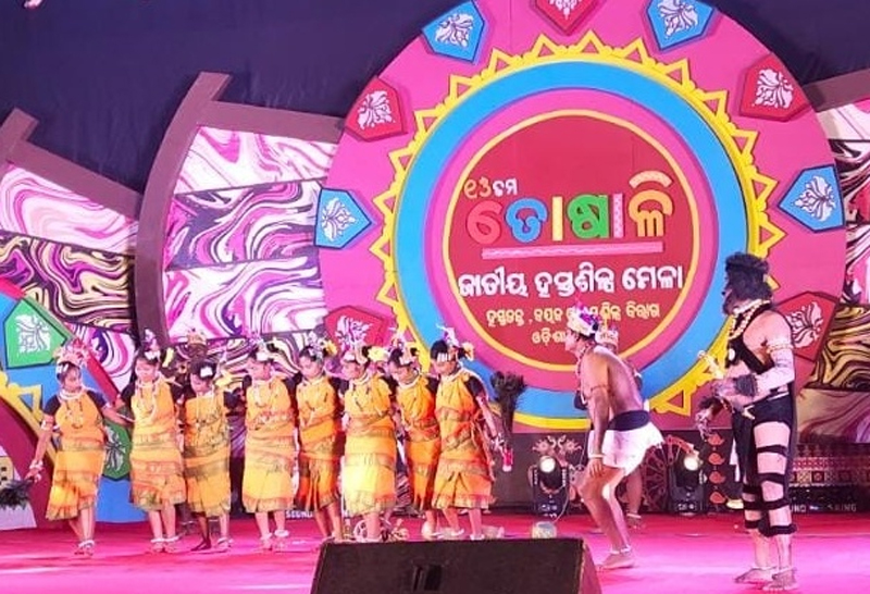 ପାରଳାଖେମୁଣ୍ଡି / ବାଳକୃଷ୍ଣ ପାଣିଗ୍ରାହୀ : ଭୁବନେଶ୍ୱର ସ୍ଥିତ ଜନତା ମଇଦାନ ଠାରେ ଓଡିଶା ସରକାରଙ୍କ ହସ୍ତତନ୍ତ୍ର ଓ ବୟନଶିଳ୍ପ ବିଭାଗ ପକ୍ଷରୁ ଚାଲିଥିବା ୧୭ ତମ ତୋଷାଳୀ ଜାତୀୟ ହସ୍ତଶିଳ୍ପ ମେଳାର ମଞ୍ଚରେ ନୃତ୍ୟ ପରିବେଷଣ କରିଥିଲେ ଗଜପତି ଜିଲ୍ଲା ପାରଳାଖେମୁଣ୍ଡିର କ୍ରିଏଟିଭ ଆର୍ଟସ୍ ର କଳାକାର ମାନେ।
