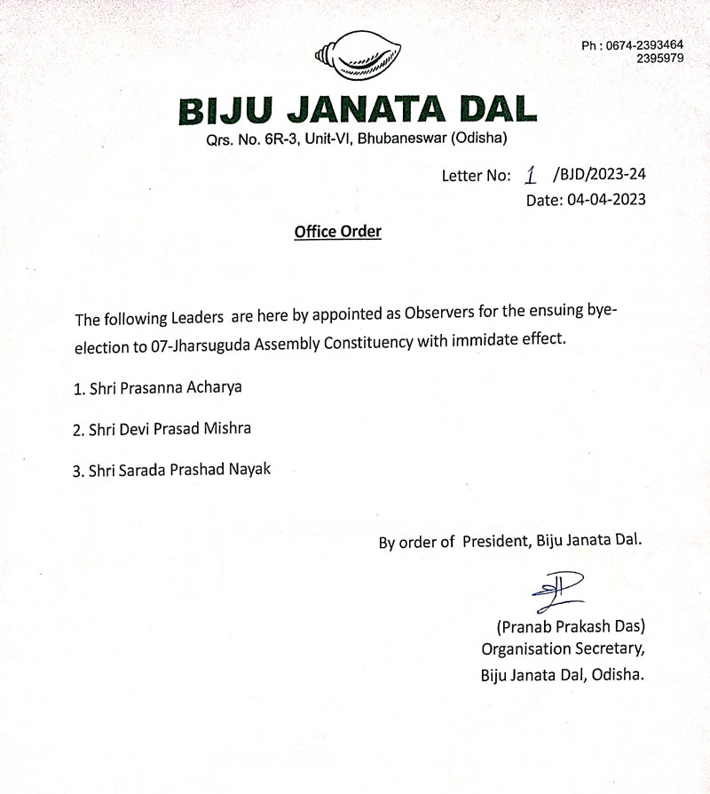 ଭୁବନେଶ୍ୱର : ଝାରସୁଗୁଡା ଉପନିର୍ବାଚନ ପାଇଁ ନିଯୁକ୍ତ ହେଲେ ଵିକେଡ଼ିର ତିନି ପର୍ଯ୍ୟବେକ୍ଷକ | ଦଳର ସଭାପତି ନବୀନ ପଟ୍ଟନାୟକଙ୍କ ଅନୁମୋଦନ କ୍ରମେ ଦଳର ବରିଷ୍ଠ ନେତା ପ୍ରସନ୍ନ ଆଚାର୍ଯ୍ୟ, ଦେବୀ ପ୍ରସାଦ ମିଶ୍ର ଓ ଜିଲ୍ଲା ପର୍ଯ୍ୟବେକ୍ଷକ ଥିବା ସାରଦା ପ୍ରସାଦ ନାୟକଙ୍କୁ ପର୍ଯ୍ୟବେକ୍ଷକ ଭାବେ ନିଯୁକ୍ତ କରାଯାଇଛି ବୋଲି ସଂଗଠନ ସମ୍ପାଦକ ପ୍ରଣବ ପ୍ରକାଶ ଦାସ ସୂଚନା ଦେଇଛନ୍ତି |