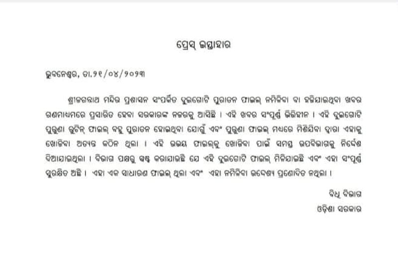 ରାଜ୍ୟ ଶ୍ରୀମନ୍ଦିର ଫାଇଲ ନିଖୋଜ ପ୍ରସଙ୍ଗ : ଆଇନ ସଚିବ କହିଲେ "ଫାଇଲ ମିଳିଲା" 21 April 2023 Hits: 271 Rating: ( 0 Rating ) User Rating: 0 / 5 Please Rate Vote 1 Vote 2 Vote 3 Vote 4 Vote 5 000s2sdefault twitter twitter facebook google plus whatsapp share