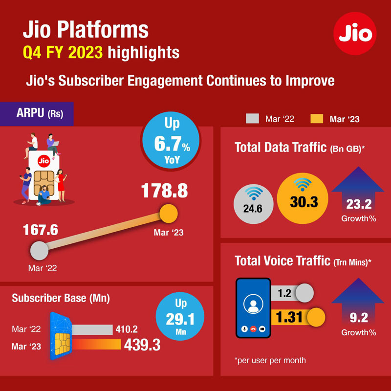 ତ୍ରୈମାସିକ ତଥ୍ୟ ଅନୁସାରେ ଜିଓର ଗ୍ରାହକ ପିଛା ହାରାହାରି ମାସିକ ରାଜସ୍ୱ (ଆର୍ପୁ) ୧୭୮.୮ ଟଙ୍କାକୁ ବୃଦ୍ଧି ପାଇଛି । କଂପାନିର ନେଟ୍ୱର୍କରେ ପ୍ରତିଦିନ ବ୍ୟବହାରକାରୀମାନେ ୧୪୫୯ କୋଟି ମିନିଟ୍ ଭଏସ୍ କଲିଂରେ କଥାବାର୍ତା ହେଉଛନ୍ତି । ଏହାର ଅର୍ଥ ହେଉଛି ଜିଓ ନେଟ୍ୱର୍କରେ ପ୍ରତି ଗ୍ରାହକ ପ୍ରତି ମାସରେ ହାରାହାରି ୧୦୦୩ ମିନିଟ୍ ଭଏସ୍ କଲ୍ରେ କଥାବାର୍ତା ହେଉଛନ୍ତି ।