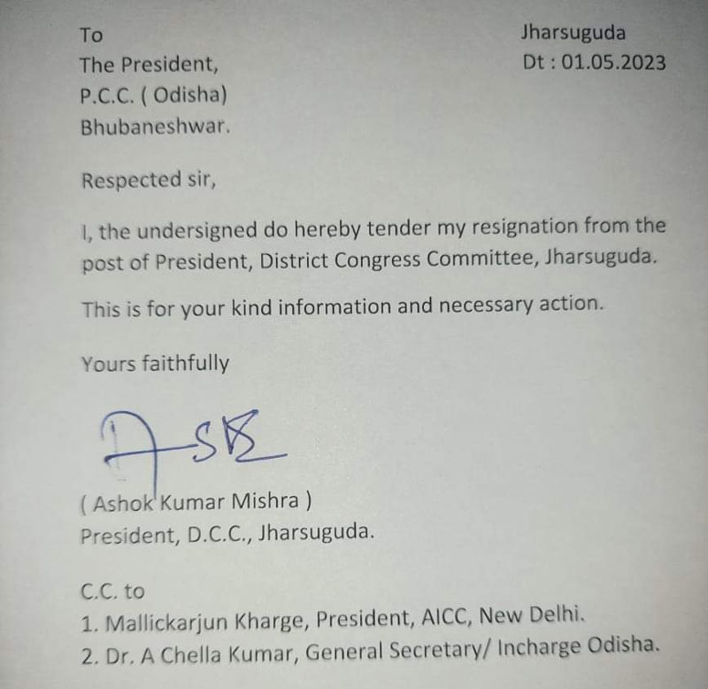 ରାଜ୍ୟ ଝାରସୁଗୁଡ଼ା ଜିଲ୍ଲା କଂଗ୍ରେସ ସଭାପତି ପଦରୁ ଇସ୍ତଫା ଦେଲେ ଅଶୋକ ମିଶ୍ର । 01 May 2023 Hits: 240 Rating: ( 0 Rating ) User Rating: 0 / 5 Please Rate Vote 1 Vote 2 Vote 3 Vote 4 Vote 5 000s2sdefault twitter twitter facebook google plus whatsapp share