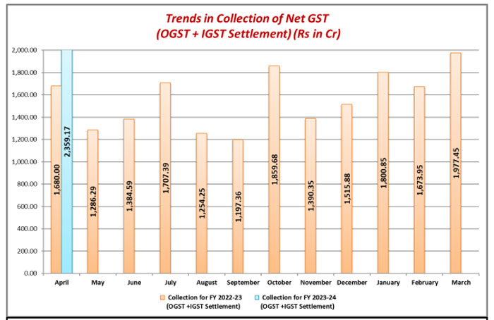 ସେହିପରି ରାଜ୍ୟ ଜିଏସଟି (ଓଜିଏସଟି) ଓ ସମନ୍ବିତ ଜିଏସଟି (ଆଇଜିଏସଟି) ଫଇସଲା ବାବଦକୁ ୨୦୨୩ ମସିହା ଏପ୍ରିଲ ମାସରେ ଓଡିଶାକୁ ମିଳବାକୁ ଥିବା ଜିଏସଟି ପରିମାଣ ଯଦି ବିଚାରକୁ ନିଆଯାଏ ତେବେ ଦେଖାଯିବ ଯେ ଏହି କ୍ଷେତ୍ରରେ ୨୩୫୯.୧୭ କୋଟି ଟଙ୍କା ସଂଗ୍ରହ କରାଯାଇଛି । ଗତ ବର୍ଷ ଏପ୍ରିଲ ମାସରେ ସଂଗ୍ରହ ରାଶି ୧୬୮୦ କୋଟି ଟଙ୍କା ତୁଳନାରେ ୪୦.୪୩ ପ୍ରତିଶତ ଅଭିବୃଦ୍ଧି ଘଟିଛି । ମୁଖ୍ୟତଃ ସେବା କ୍ଷେତ୍ରରେ ହୋଇଥିବା ଅଭିବୃଦ୍ଧି ଏବଂ କିଛି ମାତ୍ରାରେ କାରବାର କ୍ଷେତ୍ର ଯୋଗୁ ଏହି ବୃଦ୍ଧି ପରିଲକ୍ଷିତ ହୋଇଛି ।