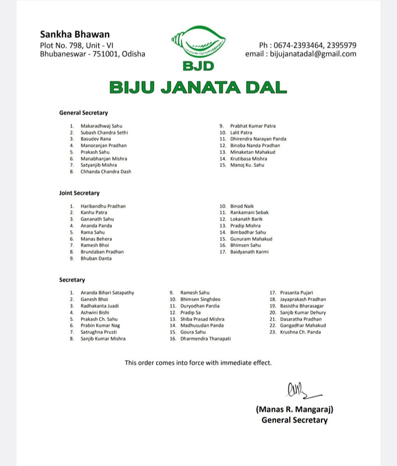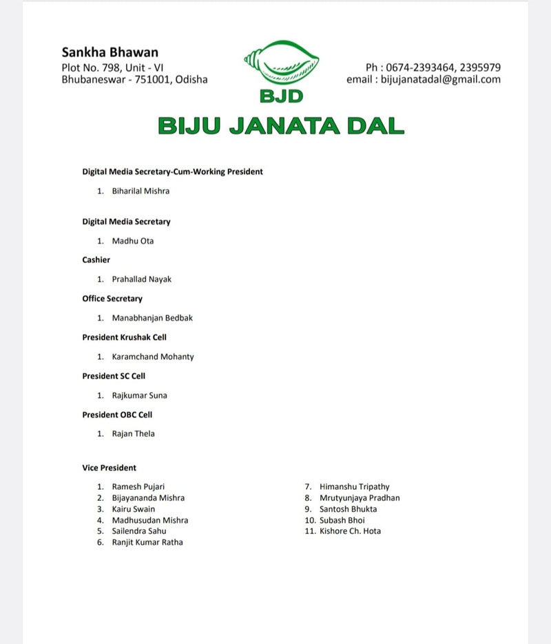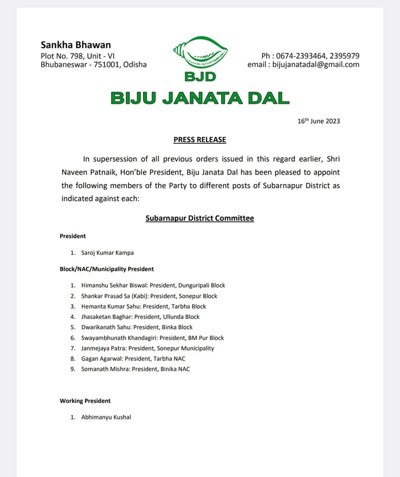 ଭୁବନେଶ୍ୱର : ପୂର୍ବରୁ ସମସ୍ତ ଆଦେଶକୁ ବାତିଲ କରି ବିଜୁ ଜନତାଦଳ ସଭାପତି ଶ୍ରୀ ନବୀନ ପଟ୍ଟନାୟକ ସୁବର୍ଣ୍ଣପୁର ଜିଲ୍ଲା ବିଜେଡ଼ିକୁ ପୁନର୍ଗଠିତ କରିଛନ୍ତି | ଦଳର ସଭାପତିଙ୍କ ଅନୁମୋଦନକ୍ରମେ ସୁବର୍ଣ୍ଣପୁର ଜିଲ୍ଲା ବିଜୁ ଜନତା ଦଳରେ ନୂତନ କର୍ମକର୍ତ୍ତା ନିଯୁକ୍ତ ହୋଇଛନ୍ତି ବୋଲି ଦଳର ସାଧାରଣ ସମ୍ପାଦକ ଶ୍ରୀ ମାନସ ମଙ୍ଗରାଜ ସୂଚନା ଦେଇଛନ୍ତି | ଏହି ପୁନର୍ଗଠିତ କମିଟିରେ ସରୋଜ କୁମାର କାମ୍ପ ସଭାପତିଭାବେ ନିଯୁକ୍ତ ହୋଇଥିବା ବେଳେ ଅଭିମନ୍ୟୁ କୁଶଳ କାର୍ଯ୍ୟକାରୀ ସଭାପତି ଭାବେ ନିଯୁକ୍ତ ହୋଇଛନ୍ତି | ଦଳର ନିମ୍ନଲିଖିତ ସଦସ୍ୟମାନେ ସୁବର୍ଣ୍ଣପୁର ଜିଲ୍ଲାର ବିଭିନ୍ନ ପଦବୀରେ ମଧ୍ୟ ନିଯୁକ୍ତ ହୋଇଅଛନ୍ତି |