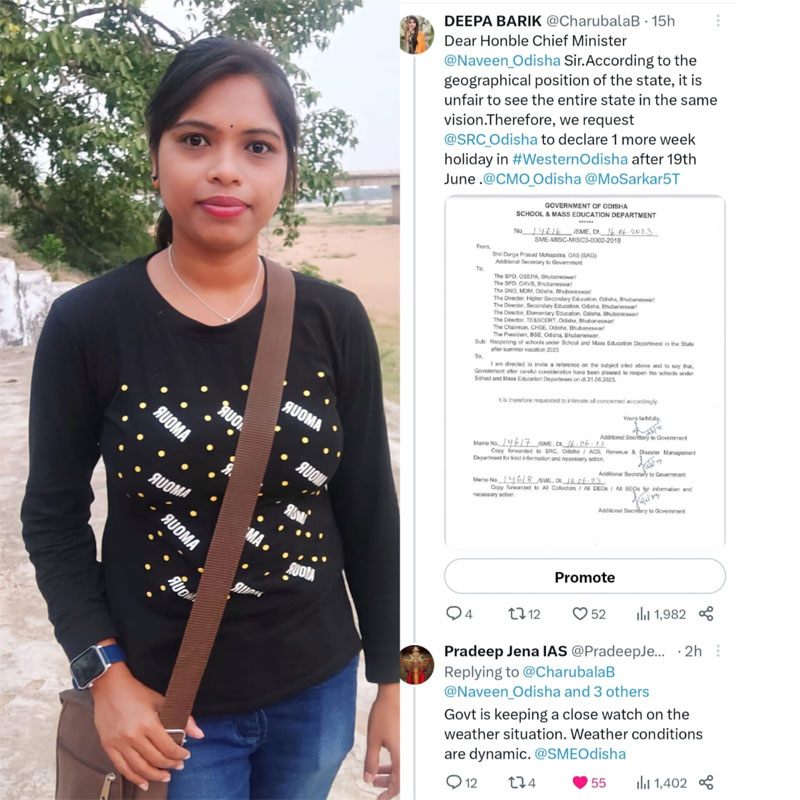 ବର୍ତ୍ତମାନ ସମୟରେ ପଶ୍ଚିମ ଓଡ଼ିଶାରେ ପ୍ରଚଣ୍ଡ ଗ୍ରୀଷ୍ମ ପ୍ରବାହ ଯୋଗୁଁ ଜନଜୀବନ ଅସ୍ତବ୍ୟସ୍ତ ହୋଇପଡିଛି, ଲୋକେ ଅଂଶୁଘାତର ଶିକାର ମଧ୍ୟ ହେଉଛନ୍ତି।ଏଭଳି ସ୍ଥିତିରେ କୁନି କୁନି ଛାତ୍ରଛାତ୍ରୀ ମାନଙ୍କ ବୃହତ ସ୍ୱାର୍ଥ ଦୃଷ୍ଟିରୁ ଗ୍ରୀଷ୍ମ ଅବକାଶ ସମୟ ୧୯ ତାରିଖ ପରେ ଅନ୍ୟୁନ ଗୋଟିଏ ସପ୍ତାହ ବଢ଼େଇବା ପାଇଁ ଟ୍ୱିଟର ମାଧ୍ୟମରେ ଅନୁରୋଧ କରିଥିଲେ।ସେ ଲେଖିଥିଲେ ଯେ ଭୌଗଳିକ ସ୍ଥିତି ଦୃଷ୍ଟିକୋଣରୁ ଉପକୂଳ ଓଡ଼ିଶା ଏବଂ ପଶ୍ଚିମ ଓଡ଼ିଶାର ପାଣିପାଗ ସମ୍ପୂର୍ଣ୍ଣ ଭିନ୍ନ ଅଟେ ତେଣୁ ଉଭୟ ପ୍ରାନ୍ତକୁ ସମାନ ଦୃଷ୍ଟିରେ ଦେଖିବା ଅନୁଚିତ ଅଟେ।ତେଣୁ ପିଲାମାନଙ୍କ ସୁରକ୍ଷା ଦୃଷ୍ଟିରୁ ପଶ୍ଚିମ ଓଡ଼ିଶାରେ ଗ୍ରୀଷ୍ମ ଅବକାଶ ସମୟକୁ ଗୋଟିଏ ସପ୍ତାହ ବଢ଼େଇବା ପାଇଁ ଗତକାଲି ରାତିରେ ଅନୁରୋଧ କରିଥିଲେ ଯାହାକୁ ମୁଖ୍ୟ ଶାସନ ସଚିବ ପ୍ରଦୀପ ଜେନା ଅତ୍ୟନ୍ତ ଗୁରୁତ୍ତ୍ୱ ସହ ଗ୍ରହଣ କରି ଉତ୍ତର ରଖିଛନ୍ତି ଯେ ରାଜ୍ୟ ସରକାର ଏହା ଉପରେ ତୀକ୍ଷ୍ଣ ଦୃଷ୍ଟି ରଖିଛନ୍ତି।ଯେହେତୁ ପାଣିପାଗ ଯେହେତୁ ବଦଳିଥାଏ ଆବଶ୍ୟକ ସ୍ଥଳେ ପଦକ୍ଷେପ ଗ୍ରହଣ କରାଯାଇପାରେ ବୋଳି ସୂଚନା ରହିଛି।
