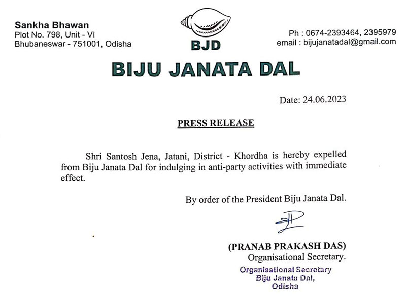 ଭୁବନେଶ୍ୱର : ଜଟଣୀ ନିର୍ବାଚନମଣ୍ଡଳୀର ବିଜେଡି ନେତା ସନ୍ତୋଷ ଜେନାଦଳ ବିରୋଧୀ କାର୍ଯ୍ୟ ପାଇଁ ବିଜେଡିରୁ ବହିଷ୍କୃତ ହୋଇଛନ୍ତି | ଏ ବିଷୟ ବିଜେଡି ସାଙ୍ଗଠନିକ ସମ୍ପାଦକ ପ୍ରଣବ ପ୍ରକାଶ ଦାସ ଏକ ପ୍ରେସ ବିଜ୍ଞପ୍ତିରେ ସୂଚନା ଦେଇଛନ୍ତି |