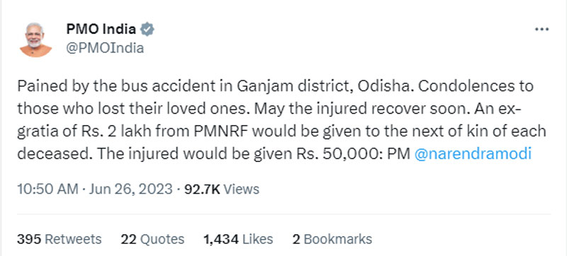 ନୂଆଦିଲ୍ଲୀ : ଓଡ଼ିଶାର ଗଞ୍ଜାମ ଜିଲ୍ଲାର ଦିଗପହଣ୍ଡିରେ ଘଟିଥିବା ମର୍ମନ୍ତୁଦ ବସ ଦୁର୍ଘଟଣାରେ ପ୍ରଧାନମନ୍ତ୍ରୀ ନରେନ୍ଦ୍ର ମୋଦି ଦୁଃଖ ପ୍ରକାଶ କରିଛନ୍ତି | ପ୍ରଧାନମନ୍ତ୍ରୀ ଏକ ଶୋକବାର୍ତ୍ତାରେ କହିଛନ୍ତି " ଏହି ଦୁଖଦ ଘଟଣାରେ ମୁଁ ମର୍ମାହତ | ମୃତକଙ୍କ ପରିବାର ବର୍ଗଙ୍କୁ ସମବେଦନା ଜଣାଉଛି । ଆହତଙ୍କ ଆଶୁ ଆରୋଗ୍ୟ କାମନା କରୁଛି । ପ୍ରଧାନମନ୍ତ୍ରୀ ରାଷ୍ଟ୍ରୀୟ ରିଲିଫ୍ ପାଣ୍ଠି(PMNRF)ରୁ ମୃତକଙ୍କ ପରିବାରକୁ ୨ ଲକ୍ଷ ଟଙ୍କା ଅନୁକମ୍ପା ମୂଳକ ସହାୟତା ରାଶି ପ୍ରଦାନ କରାଯିବ । ଆହତ ମାନଙ୍କୁ ୫୦ ହଜାର ଟଙ୍କାର ସହାୟତା ରାଶି ଯୋଗାଇ ଦିଆଯିବ" |