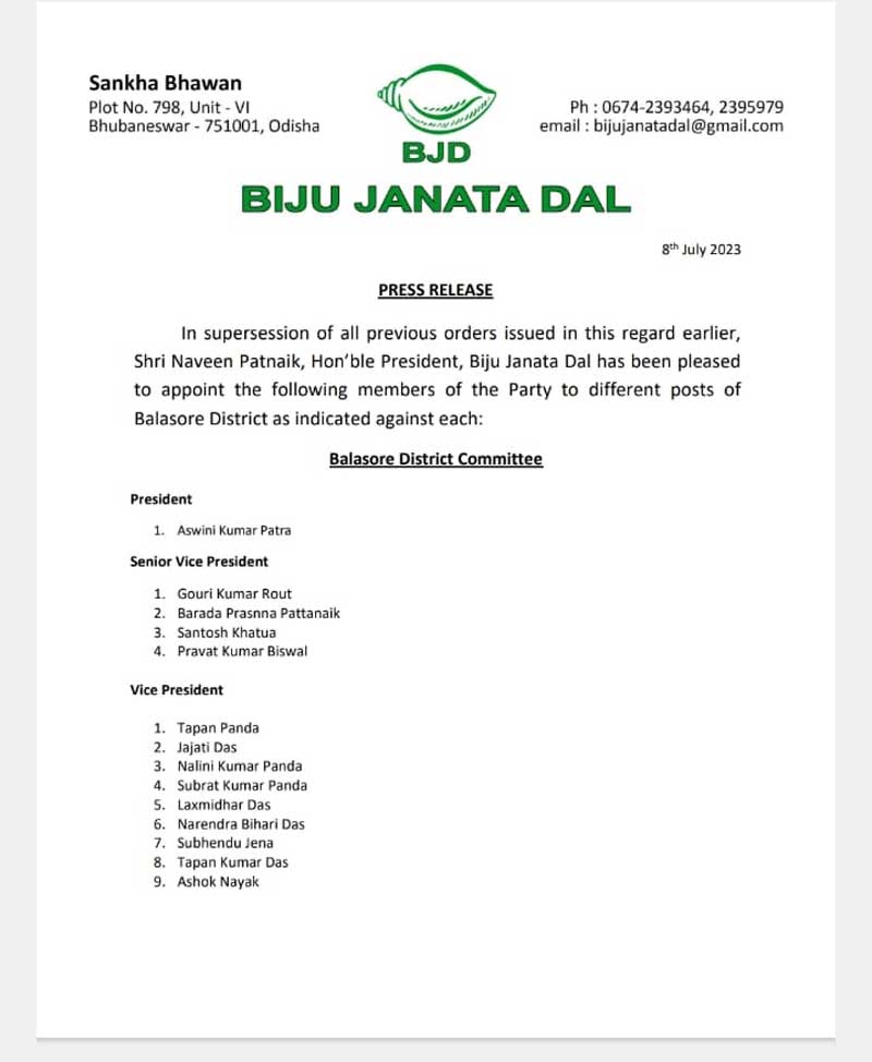 ଭୁବନେଶ୍ୱର : ପୁନର୍ଗଠିତ ହେଲା ବାଲେଶ୍ୱର ଜିଲ୍ଲା ବିଜେଡି କମିଟି | ନୂଆ କମିଟିରେ ୪ ବରିଷ୍ଠ ଉପସଭାପତି, ୯ ଉପସଭାପତି, ୧୬ ସାଧାରଣ ସମ୍ପାଦକ, ୨୨ ସମ୍ପାଦକ, ୨୩ ଯୁଗ୍ମ ସମ୍ପାଦକ , ଜଣେ କୋଷାଧ୍ୟକ୍ଷ ଓ ଜଣେ ଗଣମାଧ୍ୟମ ସଂଯୋଜକ ରହିଛନ୍ତି ବୋଲି ବିଜେଡି ରାଜ୍ୟ ସାଧାରଣ ସମ୍ପାଦକ ଶ୍ରୀ ମାନସ ରଞ୍ଜନ ମଙ୍ଗରାଜ ସୂଚନା ଦେଇଛନ୍ତି | ସୂଚନାଯୋଗ୍ୟ ଯେ ପୂର୍ବରୁ ଅଶ୍ୱିନୀ ପାତ୍ରଙ୍କୁ ଜିଲ୍ଲା ବିଜେଡି ସଭାପତି ଭାବେ ନିଯୁକ୍ତି ଦେଇଥିଲେ ବିଜେଡି ସୁପ୍ରିମୋ |