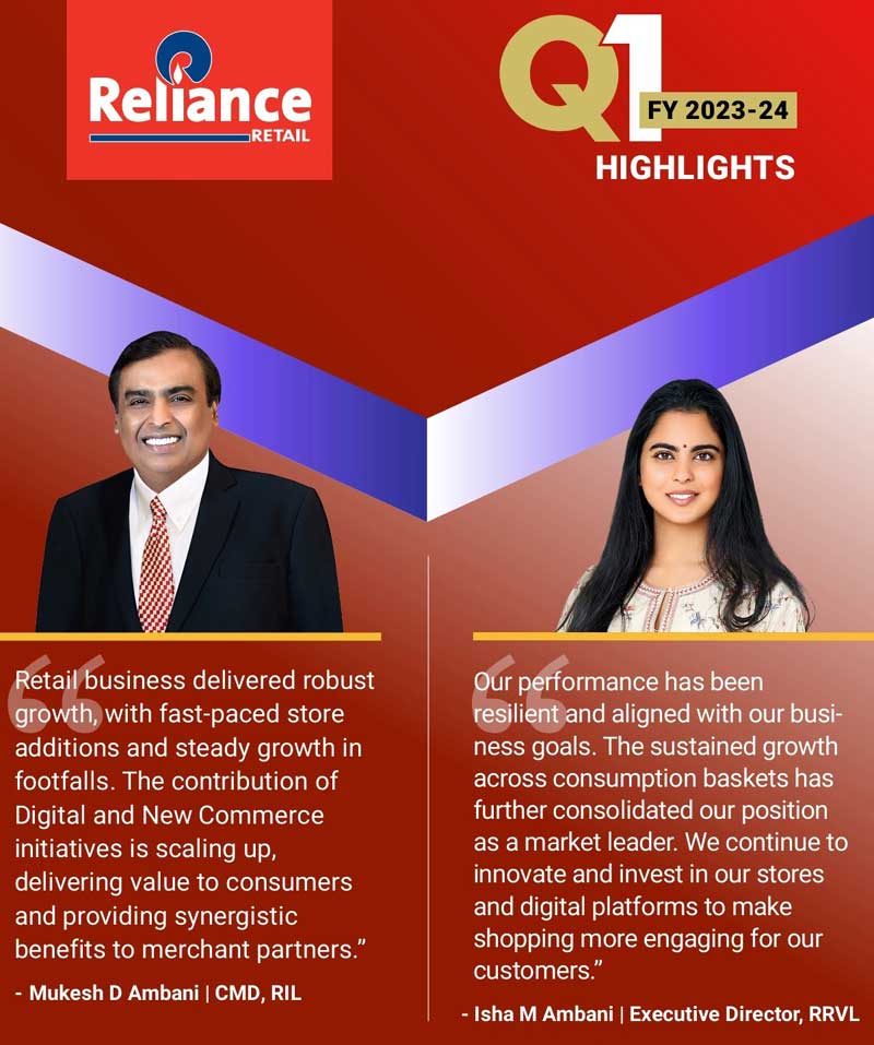 ରିଲାଏନ୍ସ ଇଣ୍ଡଷ୍ଟ୍ରିଜ୍ ଲିମିଟେଡ୍ର ଅଧ୍ୟକ୍ଷ ଓ ପରିଚାଳନା ନିର୍ଦ୍ଦେଶକ ମୁକେଶ ଅମ୍ବାନି କହିଛନ୍ତି ଯେ, “ଦ୍ରୁତ ଗତିରେ ଷ୍ଟୋର ସଂଖ୍ୟା ବୃଦ୍ଧି ଓ ଗ୍ରାହକଙ୍କ ପ୍ରବେଶରେ ଅଭିବୃଦ୍ଧି ଯୋଗୁଁ ରିଟେଲ୍ ବ୍ୟବସାୟର ଅଭିବୃଦ୍ଧି ବେଶ ଦୃଢ଼ ହୋଇପାରିଛି । ଡିଜିଟାଲ୍ ଓ ନୂଆ ବାଣିଜ୍ୟ କ୍ଷେତ୍ରର ଅବଦାନ ବୃଦ୍ଧି ପାଇଥିବା ବେଳେ ତାହା ଗ୍ରାହକଙ୍କୁ ଉଚିତ ମୂଲ୍ୟ ପ୍ରଦାନ କରୁଛି ଏବଂ ବ୍ୟବସାୟୀ ସହଯୋଗୀଙ୍କୁ ମଧ୍ୟ ଲାଭ ପ୍ରଦାନ କରୁଛି ।”