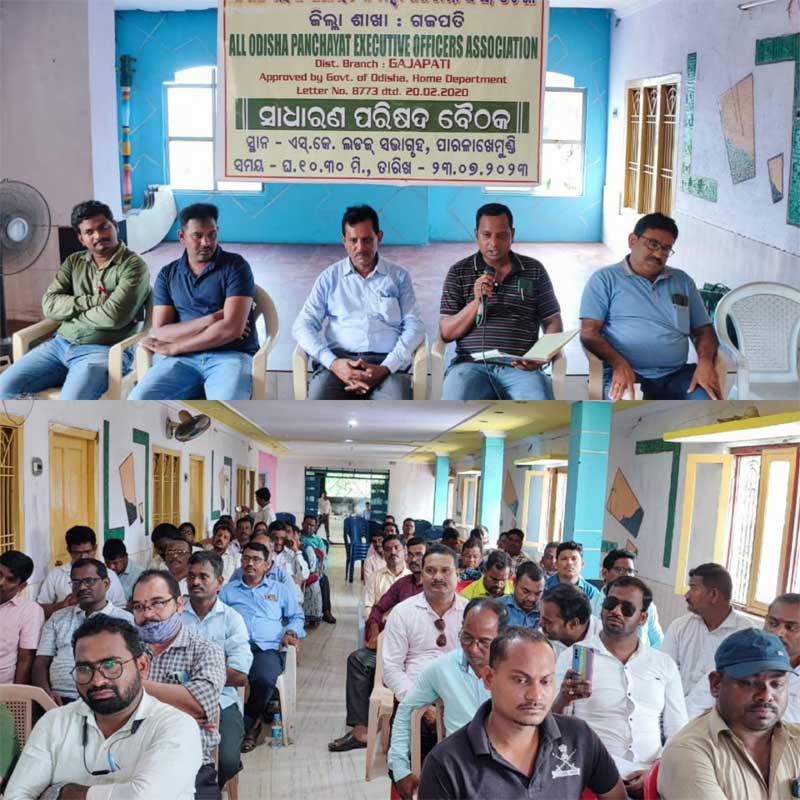 ପାରଳାଖେମୁଣ୍ଡି / ବାଳକୃଷ୍ଣ ପାଣିଗ୍ରାହୀ : ଗଜପତି ଜିଲ୍ଲାର ବାର୍ଷିକ ସମ୍ମିଳନୀ ସ୍ଥାନୀୟ ଏସ୍ କେ ଲଡ୍ଜ ସମ୍ମିଳନୀ କକ୍ଷରେ ସଭାପତି ଶ୍ରୀ ରାଜେନ୍ଦ୍ର କୁମାର ରଥଙ୍କ ଅଧ୍ୟକ୍ଷତାରେ ଅନୁଷ୍ଠିତ ହୋଇଥିଲା। ଏହି କାର୍ଯ୍ୟକ୍ରମରେ ସମ୍ପାଦକ ଶ୍ରୀ ସନ୍ତୋଷ କୁମାର ବାହାଦୂର , ଉପ ସଭାପତି ଶ୍ରୀ ମଧୁ ପୋଲାକି , ସହ ସମ୍ପାଦକ ଶ୍ରୀ ରବି କୁମାର ପାତ୍ର , କୋଷାଧ୍ୟକ୍ଷ ଶ୍ରୀ ମନୋଜ ପଣ୍ଡା ଓ ରାଜ୍ୟ ସଂଯୋଜକ ଶ୍ରୀ ନୃସିଂହ ଚରଣ ମିଶ୍ର ଓ କେ ବାଳକ୍ରିଷ୍ନା ପ୍ରମୁଖ ମଞ୍ଚାସୀନ ହୋଇଥିବା ବେଳେ ସମସ୍ତ ସାତ ଗୋଟି ବ୍ଳକର ସମସ୍ତ ପଞ୍ଚାୟତ ନିବାହୀ ଅଧିକାରୀ ଯୋଗ ଦେଇଥିଲେ।
