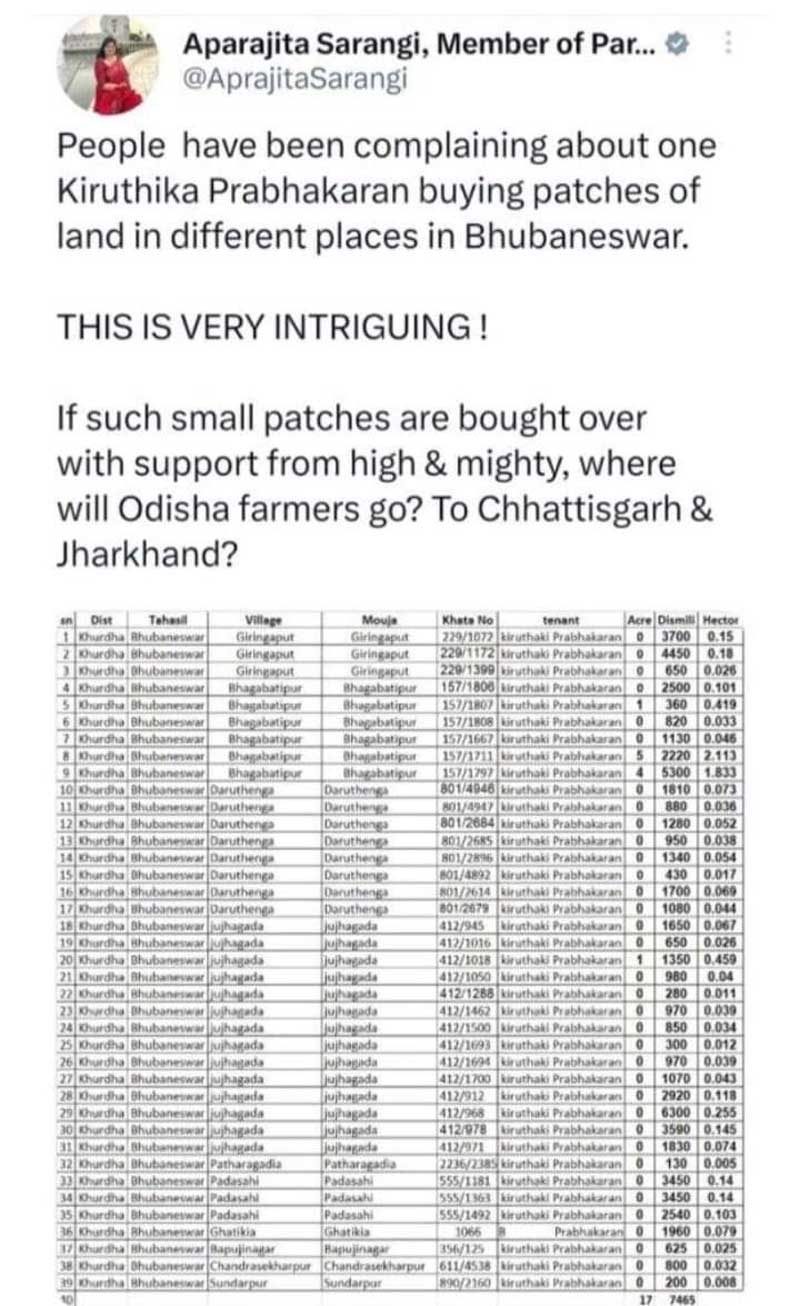 ଆଉ ଏହାକୁ ନେଇ ପ୍ରଶ୍ନ ଉଠାଇଛନ୍ତି ଭୁବନେଶ୍ବର ସାଂସଦ ଅପରାଜିତା ଷଡ଼ଙ୍ଗୀ | ରାଜଧାନୀ ଭୁବନେଶ୍ବର ତହସିଲ ଅନ୍ତର୍ଗତ ବିଭିନ୍ନ ସ୍ଥାନରେ ଜଣେ ବ୍ୟକ୍ତି ୩୯ଟି ପ୍ଲଟ କିଣିଥିବା ନେଇ ଭୁବନେଶ୍ବର ସାଂସଦ ଶ୍ରୀମତୀ ଷଡ଼ଙ୍ଗୀ ସଂଗୀନ ଅଭିଯୋଗ ଆଣିଛନ୍ତି। ଶ୍ରୀମତୀ ଷଡ଼ଙ୍ଗୀ ଟୁଇଟ୍ କରି ସେ କହିଛନ୍ତି ଯେ, କେ ପ୍ରଭାକରନ୍ ନାମରେ ଜଣେ ବ୍ୟକ୍ତି ଭୁବନେଶ୍ବରର ବିଭିନ୍ନ ସ୍ଥାନରେ ଜମି କିଣିଛନ୍ତି। ବଡ଼ବଡ଼ିଆଙ୍କ ସହଯୋଗ ବିନା ଜଣେ ବ୍ୟକ୍ତି ଏତେସଂଖ୍ୟକ ଜମି କିଣିବା କ’ଣ ସମ୍ଭବ ବୋଲି ସେ ପ୍ରଶ୍ନ ଉଠାଇଛନ୍ତି। ଯଦି ଜଣେ ବ୍ୟକ୍ତିଙ୍କୁ ସହଯୋଗ କରି ଏତେ ପରିମାଣରେ ଜମି କିଣିବାକୁ ଅନୁମତି ଦିଆଯିବ, ତା’ହେଲେ ଓଡ଼ିଶାର ଚାଷୀ କେଉଁଠିକୁ ଯିବେ? ଛତିଶଗଡ଼ ଓ ଝାଡ଼ଖଣ୍ଡ ଯିବେ କି ବୋଲି ଅପରାଜିତା ପ୍ରଶ୍ନ କରିଛନ୍ତି। ମୋର ଭୁବନେଶ୍ବର ସଂସଦୀୟ କ୍ଷେତ୍ରର ଲୋକେ କହୁଛନ୍ତି, ସରକାରଙ୍କ ଛତ୍ରଛାୟା ତଳେ ପ୍ରଭାକରନ ଅଧିକରୁ ଅଧିକ ଜମି କିଣୁଛନ୍ତି ବୋଲି |