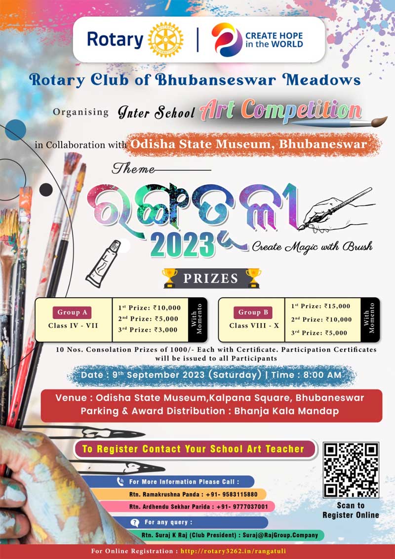 ରୋଟାରୀ କ୍ଲବ ମୀଡୋଜ ଓ ରାଜ୍ୟ ସଂଗ୍ରହାଳୟର ମିଳିତ ସହଯୋଗିତାରେ ସେପ୍ଟେମ୍ବର ୯ରେ ରଙ୍ଗତୂଳୀ 2023 ପ୍ରତିଯୋଗିତା