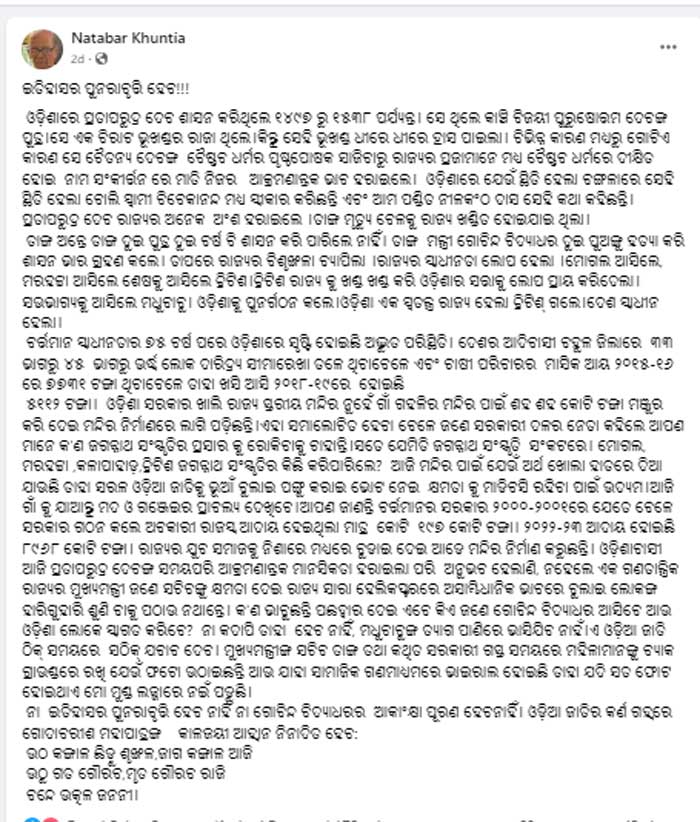 ଓଡ଼ିଶାର ଇତିହାସକୁ ସାମ୍ପ୍ରତିକ ସାମାଜିକ ଓ ରାଜନୈତିକ ବ୍ୟବସ୍ଥା ସହ ନଟବର ଖୁଣ୍ଟିଆ ବହୁତ ସଠିକ୍ ତୁଳନା କରିଛନ୍ତି, ସମସ୍ତେ ଏହାକୁ ପଢିବା ଉଚିତ୍