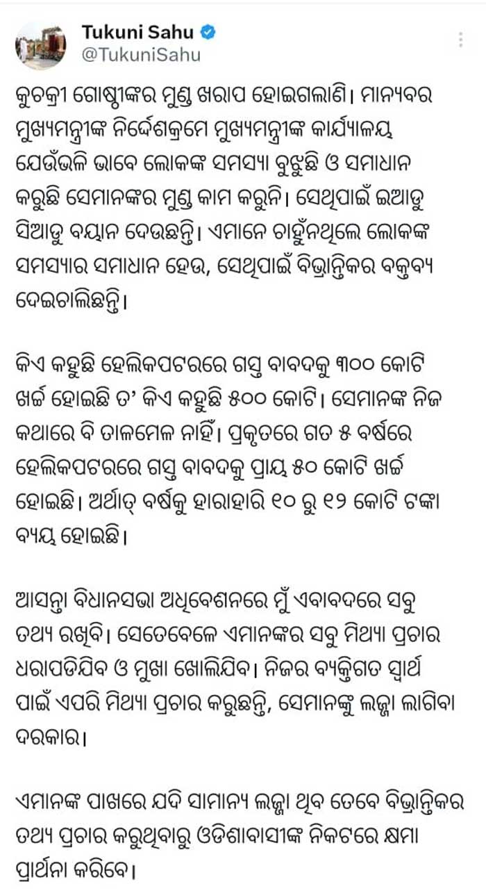ଆଜି ତାଙ୍କ ଏକ୍ସ(ପୂର୍ବର ଟୁଇଟର) ହାଣ୍ଡଲରେ ଶ୍ରୀମତୀ ସାହୁ ଉଲ୍ଲେଖ କରିଛନ୍ତି " କୁଚକ୍ରୀ ଗୋଷ୍ଠୀଙ୍କର ମୁଣ୍ଡ ଖରାପ ହୋଇଗଲାଣି। ମାନ୍ୟବର ମୁଖ୍ୟମନ୍ତ୍ରୀଙ୍କ ନିର୍ଦ୍ଦେଶକ୍ରମେ ମୁଖ୍ୟମନ୍ତ୍ରୀଙ୍କ କାର୍ଯ୍ୟାଳୟ ଯେଉଁଭଳି ଭାବେ ଲୋକଙ୍କ ସମସ୍ୟା ବୁଝୁଛି ଓ ସମାଧାନ କରୁଛି ସେମାନଙ୍କର ମୁଣ୍ଡ କାମ କରୁନି। ସେଥିପାଇଁ ଇଆଡୁ ସିଆଡୁ ବୟାନ ଦେଉଛନ୍ତି। ଏମାନେ ଚାହୁଁନଥିଲେ ଲୋକଙ୍କ ସମସ୍ୟାର ସମାଧାନ ହେଉ, ସେଥିପାଇଁ ବିଭ୍ରାନ୍ତିକର ବକ୍ତବ୍ୟ ଦେଇଚାଲିଛନ୍ତି। କିଏ କହୁଛି ହେଲିକପଟରରେ ଗସ୍ତ ବାବଦକୁ ୩୦୦ କୋଟି ଖର୍ଚ୍ଚ ହୋଇଛି ତ’ କିଏ କହୁଛି ୫୦୦ କୋଟି। ସେମାନଙ୍କ ନିଜ କଥାରେ ବି ତାଳମେଳ ନାହିଁ। ପ୍ରକୃତରେ ଗତ ୫ ବର୍ଷରେ ହେଲିକପଟରରେ ଗସ୍ତ ବାବଦକୁ ପ୍ରାୟ ୫୦ କୋଟି ଖର୍ଚ୍ଚ ହୋଇଛି। ଅର୍ଥାତ୍ ବର୍ଷକୁ ହାରାହାରି ୧୦ ରୁ ୧୨ କୋଟି ଟଙ୍କା ବ୍ୟୟ ହୋଇଛି। ଆସନ୍ତା ବିଧାନସଭା ଅଧିବେଶନରେ ମୁଁ ଏବାବଦରେ ସବୁ ତଥ୍ୟ ରଖିବି। ସେତେବେଳେ ଏମାନଙ୍କର ସବୁ ମିଥ୍ୟା ପ୍ରଚାର ଧରାପଡିଯିବ ଓ ମୁଖା ଖୋଲିଯିବ। ନିଜର ବ୍ୟକ୍ତିଗତ ସ୍ୱାର୍ଥ ପାଇଁ ଏପରି ମିଥ୍ୟା ପ୍ରଚାର କରୁଛନ୍ତି, ସେମାନଙ୍କୁ ଲଜ୍ଜା ଲାଗିବା ଦରକାର। ଏମାନଙ୍କ ପାଖରେ ଯଦି ସାମାନ୍ୟ ଲଜ୍ଜା ଥିବ ତେବେ ବିଭ୍ରାନ୍ତିକର ତଥ୍ୟ ପ୍ରଚାର କରୁଥିବାରୁ ଓଡିଶାବାସୀଙ୍କ ନିକଟରେ କ୍ଷମା ପ୍ରାର୍ଥନା କରିବେ" ବୋଲି କଡା ଜବାବ ଦେଇଛନ୍ତି ମନ୍ତ୍ରୀ ଟୁକୁନି ସାହୁ |