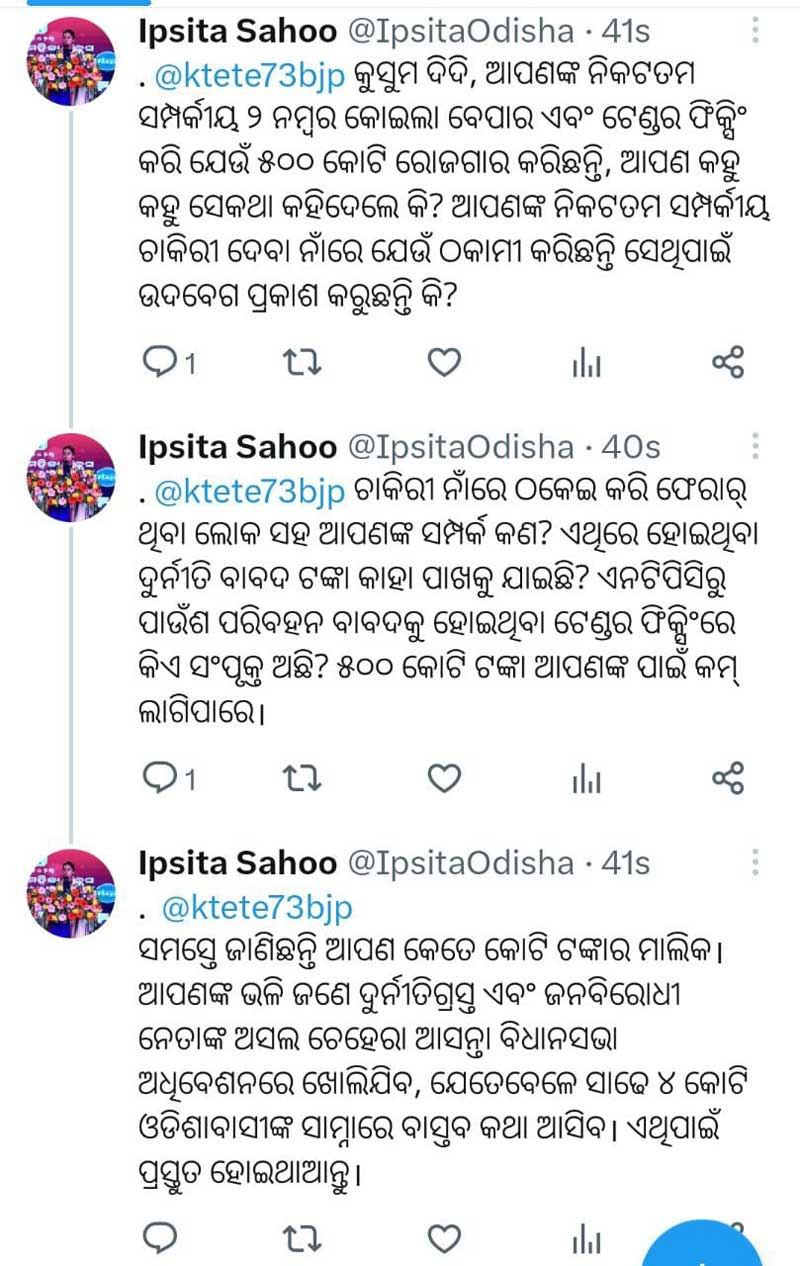 ସେ ତାଙ୍କ X ହାଣ୍ଡଲରେ ଉଲ୍ଲେଖ କରିଛନ୍ତି " କୁସୁମ ଦିଦି, ଆପଣଙ୍କ ନିକଟତମ ସମ୍ପର୍କୀୟ ୨ ନମ୍ବର କୋଇଲା ବେପାର ଏବଂ ଟେଣ୍ଡର ଫିକ୍ସିଂ କରି ଯେଉଁ ୫୦୦ କୋଟି ରୋଜଗାର କରିଛନ୍ତି, ଆପଣ କହୁ କହୁ ସେକଥା କହିଦେଲେ କି? ଆପଣଙ୍କ ନିକଟତମ ସମ୍ପର୍କୀୟ ଚାକିରୀ ଦେବା ନାଁରେ ଯେଉଁ ଠକାମୀ କରିଛନ୍ତି ସେଥିପାଇଁ ଉଦବେଗ ପ୍ରକାଶ କରୁଛନ୍ତି କି?"