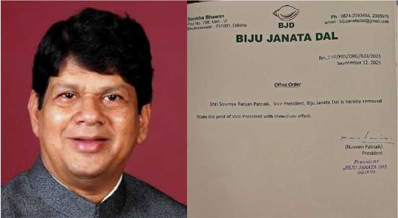 ଭୁବନେଶ୍ୱର : ନିଜ ସମ୍ପାଦକୀୟ ତଥା ଗଣମାଧ୍ୟମରେ ଲଗାତାର ଭାବେ ମୁଖ୍ୟମନ୍ତ୍ରୀଙ୍କ ସଚିବ ଭିକେ ପାଣ୍ଡିଆନଙ୍କୁ ସମାଲୋଚନା କରିଆସୁଥିବା ସମ୍ବାଦ ସଂପାଦକ ସୌମ୍ୟରଂଜନ ପଟ୍ଟନାୟକଙ୍କୁ ବିଜେଡି ସଭାପତି ନବୀନ ପଟ୍ଟନାୟକ ଦଳର ଉପସଭାପତି ପଦରୁ ନିଷ୍କାସିତ କରିଛନ୍ତି |