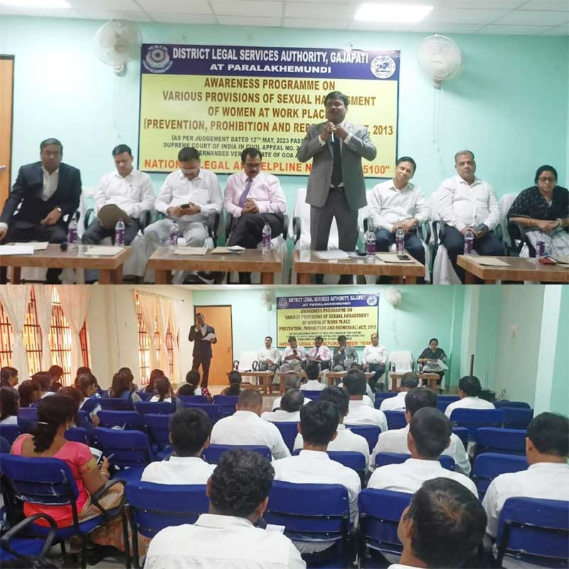 ପାରଳାଖେମୁଣ୍ଡି / ବାଳକୃଷ୍ଣ ପାଣିଗ୍ରାହୀ : ଓଡିଶା ରାଜ୍ୟ ଆଇନ ସେବା ପ୍ରାଧିକରଣ , କଟକ ଓ ମାନ୍ୟବର ଜିଲ୍ଲା ଦୌରା ଜଜ୍-ତଥା-ପ୍ରାଧିକରଣ ଅଧ୍ଯକ୍ଷ ଶ୍ରୀ ପ୍ରଣବ କୁମାର ରାଉତରାୟଙ୍କ ନିର୍ଦ୍ଦେଶକ୍ରମେ ସ୍ଥାନୀୟ ଜିଲ୍ଲା କୋର୍ଟ ସମ୍ମିଳନ କକ୍ଷଠାରେ କର୍ମକ୍ଷେତ୍ରରେ ମହିଳାଙ୍କ ଉପରେ ଯୌନ ନିର୍ଯ୍ୟାତନା (ନିବାରଣ , ନିଷେଧ ଓ ନିରାକରଣ) ଆଇନ୍ ୨୦୧୩ ଉପରେ ଏକ ସଚେତନତା ଶିବିର ଅନୁଷ୍ଠିତ ହୋଇଯାଇଛି।