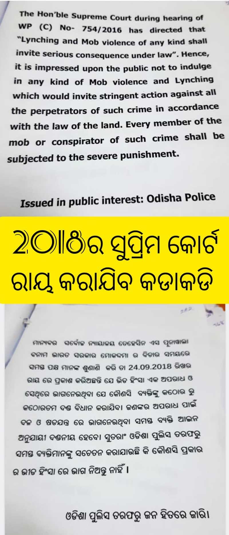 ମାନ୍ୟବର ସର୍ବୋଚ୍ଚ ନ୍ୟାୟାଳୟ ତେହେସିନ୍ ଏସ୍ ପୁନାଓ୍ୱାଲା ବନାମ ଭାରତ ସରକାର ମୋକଦ୍ଦମାର ବିଚାର ସମୟରେ ସମସ୍ତ ପକ୍ଷମାନଙ୍କ ଶୁଣାଣି କରି ୨୦୧୮ ସେପ୍ଟେମ୍ବର ୨୪ ତାରିଖ ଦିନ ରାୟରେ ପ୍ରକାଶ କରିଛନ୍ତି ଯେ ଭିଡ଼ ହିଂସା ଏକ ଅପରାଧ ଓ ସେଥିରେ ଭାଗ ନେଉଥିବା ଯେକୌଣସି ବ୍ୟକ୍ତିଙ୍କୁ କଠୋରରୁ କଠୋରତମ ଦଣ୍ଡ ବିଧାନ କରାଯିବା ଜଣଙ୍କର ଅପରାଧ ପାଇଁ ଦଳ ଓ ଷଡ଼ଯନ୍ତ୍ରରେ ଭାଗ ନେଉଥିବା ସମସ୍ତ ବ୍ୟକ୍ତି ଆଇନ ଅନୁଯାୟୀ ଦଣ୍ଡନୀୟ ହେବୋ ଏହାକୁ ଦୃଷ୍ଟିରେ ରଖି ଓଡ଼ିଶା ପୁଲିସ ତରଫରୁ ରାଜ୍ୟ ତଥା ଦେଶର ଜନସାଧାରଣଙ୍କୁ କୌଣସି ପ୍ରକାଶ ଭିଡ଼ ହିଂସାରେ ଭାଗ ନନେବା ପାଇଁ କୁହାଯାଇଛିା