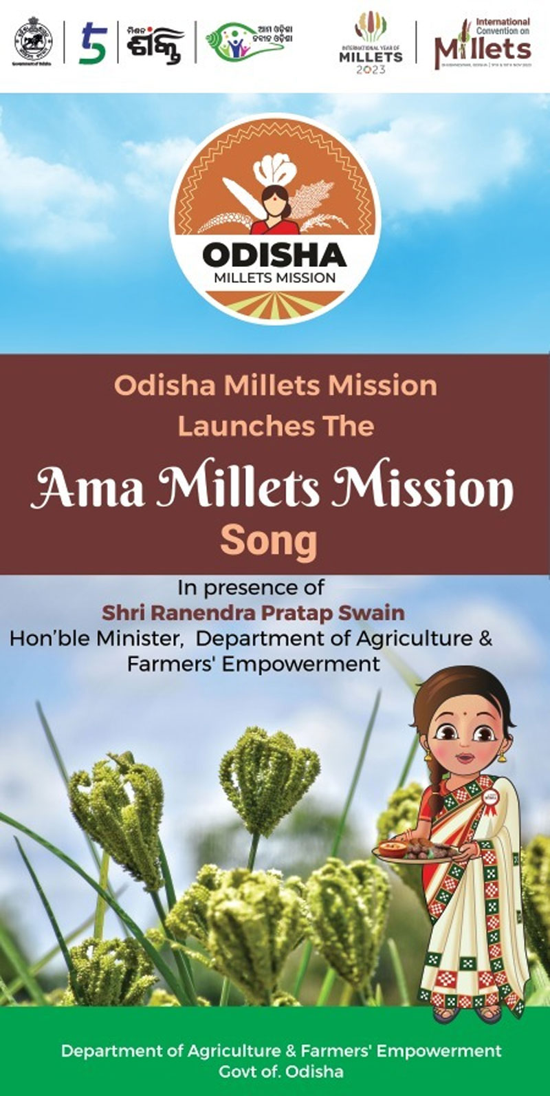 “ମିଲେଟ ଦିବସ” ବିଷୟରେ ଘୋଷଣା କରିବା ନିମନ୍ତେ ୨୦୨୩ ମସିହା ନଭେମ୍ବର ୧ ତାରିଖରେ କୃଷି ଭବନ ପରିସରରେ ଆୟୋଜିତ ଏକ ସାମ୍ବାଦିକ ସମ୍ମିଳନୀ ଅବସରରେ ଓଡ଼ିଶାର ସୁଖ୍ୟାତ ଗୀତିକାର ବାପୁ ଗୋସ୍ୱାମୀଙ୍କ ଦ୍ୱାରା ରଚିତ “ଆମ ମିଲେଟ୍ସ ମିଶନ୍” ସଂଗୀତକୁ ଓଡ଼ିଶାର ଜନ ସାଧାରଣଙ୍କ ଉଦ୍ଦେଶ୍ୟରେ ସମର୍ପିତ କରାଯାଇଛି । ଏହି ଅବସରରେ ମାନ୍ୟବର କୃଷି ଓ କୃଷକ ସଶକ୍ତିକରଣ ମନ୍ତ୍ରୀ ଶ୍ରୀ ରଣେନ୍ଦ୍ର ପତାପ ସ୍ୱାଇଁ, କୃଷି ଓ କୃଷକ ସଶକ୍ତିକରଣ ବିଭାଗର ପ୍ରମୁଖ ସଚିବ ଡ. ଅରବିନ୍ଦ ପାଢ଼ି, କୃଷି ଓ ଖାଦ୍ୟ ଉତ୍ପାଦନ ବିଭାଗର ନିର୍ଦ୍ଦେଶକ ଶ୍ରୀଯୁକ୍ତ ପ୍ରେମଚନ୍ଦ୍ର ଚୌଧୁରୀ ପ୍ରମୁଖ ଉପସ୍ଥିତ ଥିଲେ । ମିଲେଟ୍ସ ବ୍ୟବହାରର ଗୁରୁତ୍ୱ ତଥା ମିଲେଟ କିପରି ରାଜ୍ୟର କୃଷିକୁ ଏକ ନୂତନ ରୂପ ଦେବାରେ ପ୍ରମୁଖ ଭୂମିକା ଗ୍ରହଣ କରୁଛି ତାହା ଏହି ଗୀତରେ ବର୍ଣ୍ଣିତ ହୋଇଛି । ଯେକୌଣସି ପ୍ରତିକୂଳ ପରିସ୍ଥିତିରେ ତଥା ସ୍ୱଳ୍ପ ଖର୍ଚ୍ଚରେ ବଢ଼ି ପାରୁଥିବା ମିଲେଟ୍ସକୁ ରାଜ୍ୟ ସରକାର ଯେପରି ପ୍ରୋତ୍ସାହିତ କରୁଛନ୍ତି ତାହା ଗୀତରେ ଉଲ୍ଲେଖ ରହିଛି ।