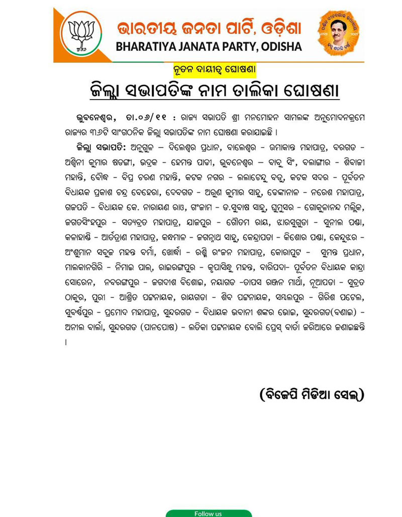 ଭୁବନେଶ୍ୱର, ତା.୦୬/୧୧ : ବିଜେପି ରାଜ୍ୟ ସଭାପତି ଶ୍ରୀ ମନମୋହନ ସାମଲଙ୍କ ଅନୁମୋଦନକ୍ରମେ ରାଜ୍ୟର ୩୬ଟି ସାଂଗଠନିକ ଜିଲ୍ଲା ସଭାପତିଙ୍କ ନାମ ଘୋଷଣା କରାଯାଇଛି ।