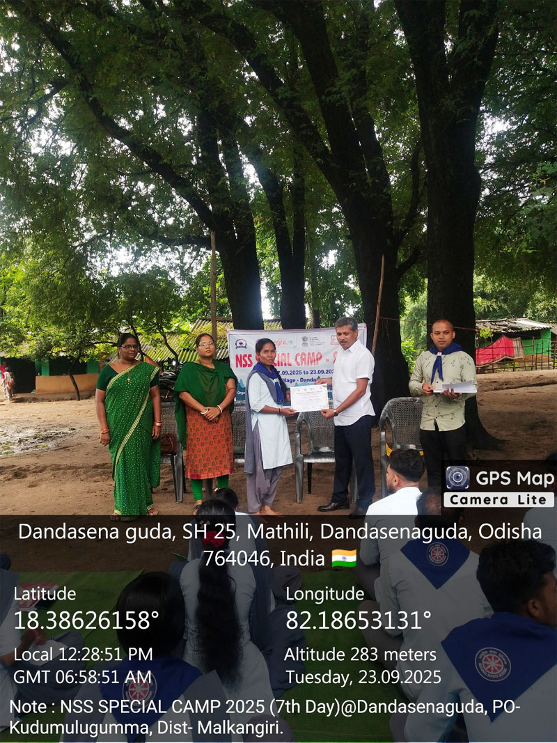 ମାଲକାନଗିରି ରୁ ସୁରେନ୍ଦ୍ର ବେମାଳ: ଡାରୱିନ୍ ମେମୋରିଆଲ୍ ଡିଗ୍ରୀ କଲେଜ, କୁଡୁମୁଲୁଗୁମ୍ମା, ଜିଲ୍ଲା-ମାଲକାନଗିରିର NSS ସହ-ୟୁନିଟ୍ ୧ ପକ୍ଷରୁ ୧୭.୦୯.୨୦୨୫ ରୁ ୨୩.୦୯.୨୦୨୫ ପର୍ଯ୍ୟନ୍ତ ଦଣ୍ଡାଶେଣାଗୁଡାରେ ଆୟୋଜିତ NSS ସ୍ଵତନ୍ତ୍ର ଶିବିରର ସମାପନୀ ସଭା ୨୩.୦୯.୨୦୨୫ ତାରିଖରେ ଆୟୋଜିତ ହୋଇଯାଇଅଛି। ଏହି ସଭାରେ ସ୍ଥାନୀୟ ମହାବିଦ୍ୟାଳୟର ଅଧ୍ୟକ୍ଷ ଅଶୋକ କୁମାର ପ୍ରଧାନ, ଓଡ଼ିଆ ଆଧ୍ୟାପିକା ସଞ୍ଜିତା ଖୋସଲା, ଶିକ୍ଷା ଆଧ୍ୟାପିକା ଶ୍ରୀଦେବୀ ପରିଡା,୫୩ ଜଣ NSS ସ୍ଵେଚ୍ଛାସେବୀ, ଓ ସ୍ଥାନୀୟ ଗ୍ରାମବାସୀମାନେ ଉପସ୍ଥିତ ଥିଲେ I NSS ପ୍ରୋଗ୍ରାମ୍ ଅଫିସର ବିଶ୍ୱଜିତ ମହାନ୍ତି ସ୍ୱାଗତ ଭାଷଣ ସହିତ କାର୍ଯ୍ୟକ୍ରମ ଆରମ୍ଭ ହୋଇଥିଲା। ସଭାରେ ବିଭିନ୍ନ NSS କାର୍ଯ୍ୟକ୍ରମ ସମ୍ବନ୍ଧୀୟ ଆଲୋଚନା, ଶିବିରରେ କରାଯାଇଥିବା କାର୍ଯ୍ୟମାନଙ୍କ ଅନୁଭବ ବାଣୀ ଓ ସ୍ଥାନୀୟ ବାସିନ୍ଦାମାନଙ୍କର ସହଯୋଗ ପାଇଁ ଧନ୍ୟବାଦ ଜଣାଇବା ହୋଇଥିଲା। ସମାପନୀ ସଭାଟି ଉତ୍ସାହମୟ ଭାବେ ଅନୁଷ୍ଠିତ ହୋଇ ସଫଳତାର ସହ ସମାପ୍ତି ଲାଭ କଲା। ସାତଦିନ ମଧ୍ୟରେ ସ୍ଵେଚ୍ଛାସେବୀମାନେ ପୋଷ୍ୟ ଗ୍ରାମ ଦଣ୍ଡସେନାଗୁଡା ଠାରେ ବୃକ୍ଷ ରୋପଣ, ସ୍ଵଛଭIରତ ଅଭିଯାନ, ମ୍ଯାଲେରିୟା ଏବଂ ଡେଙ୍ଗୁର ନିରାକରଣ, ଶିଶୁ ଶ୍ରମ ନିରାକରଣ, ବାଲ୍ୟ ବିବାହ ଏବଂ କମ ବୟସରେ ବିବାହକୁ ବିରୋଧ, ଗ୍ରାମ ସର୍ଭେ , ଗ୍ରାମର ଅଭାବ ଏବଂ ଅସୁବିଧା ଉପରେ ସଚେତନ କାର୍ଯ୍ୟକ୍ରମ କରିଥିଲେ I ସର୍ବ ଶେଷରେ ସ୍ଵେଚ୍ଛାସେବୀ ମାନଙ୍କୁ ଅଧ୍ୟକ୍ଷଙ୍କ ଦ୍ଵାରା ପ୍ରମାଣପତ୍ର ପତ୍ର ପ୍ରଦାନ କରଯାଇଥିଲା I