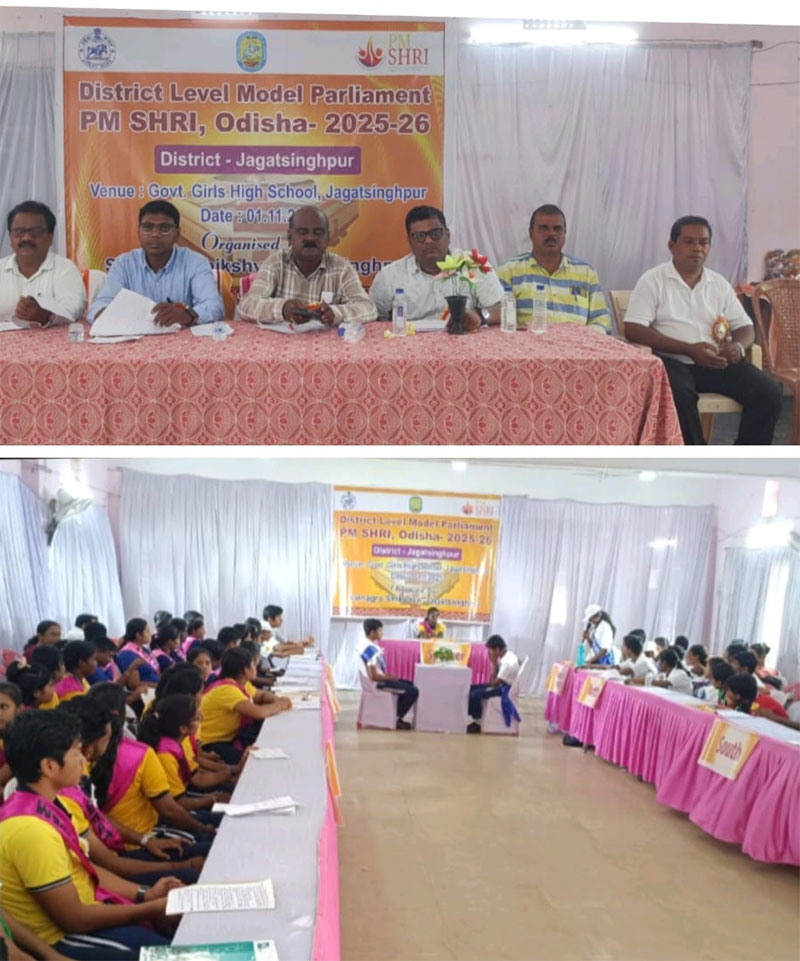 ଜଗତସିଂହପୁର,ତା-୦୧.୧୧.୨୦୨୫/ସୁମନ୍ତ କୁମାର ଦାସ:ଜଗତସିଂହପୁର ଜିଲ୍ଲା ଶିକ୍ଷା ବିଭାଗ ଆନୂକୂଲ୍ୟରେ ଜିଲ୍ଲାର ୧୦ ଗୋଟି ପିଏମଶ୍ରୀ ଉଚ୍ଚ ବିଦ୍ୟାଳୟର ୮୦ ଜଣ ଛାତ୍ରଛାତ୍ରୀଙ୍କୁ ନେଇ ଜିଲ୍ଲା ସ୍ତରୀୟ ମଡେଲ ପାଲ୍ୟାମେଣ୍ଟ ସରକାରୀ ଉଚ୍ଚ ବାଳିକା ବିଦ୍ୟାଳୟ ଜଗତସିଂହପୁର ଠାରେ ଅନୁଷ୍ଠିତ ହୋଇଯାଇଛି। ଜିଲ୍ଲା ଶିକ୍ଷା ଅଧିକାରୀ ରାଜ୍ୟଶ୍ରୀ ସାହୁଙ୍କ ଅଧ୍ୟକ୍ଷତାରେ ଅନୁଷ୍ଠିତ ହୋଇଯାଇଛି। ଉକ୍ତ କାର୍ଯ୍ୟକ୍ରମରେ ଅଧ୍ୟାପକ ହୃଦାନନ୍ଦ ସ୍ୱାଇଁ, ମନୋଜ କୁମାର ମିଶ୍ର, ଲକ୍ଷ୍ମୀଧର ପ୍ରଧାନ ଓ ଶିକ୍ଷକ ତ୍ରିଲୋଚନ ସାହୁ ବିଚାରକ ଭାବରେ ଯୋଗଦେଇ ୨ ଜଣ ଛାତ୍ରୀଙ୍କୁ ଶ୍ରେଷ୍ଠ ବକ୍ତା ଭାବରେ ମନୋନୀତ କରିଥିଲେ। ଉକ୍ତ କାର୍ଯ୍ୟକ୍ରମକୁ ବିଦ୍ୟାଳୟର ପ୍ରଧାନ ଶିକ୍ଷକ ଉଦଘାଟନ କରିଥିବା ବେଳେ ସମସ୍ତ ୧୦ ଗୋଟି ପିଏମଶ୍ରୀ ବିଦ୍ୟାଳୟର ପ୍ରଧାନ ଶିକ୍ଷକ ମାର୍ଗ ଦର୍ଶନ ଶିକ୍ଷକ ଓ ଅନ୍ୟାନ୍ୟ ଶିକ୍ଷକ ଶିକ୍ଷୟିତ୍ରୀ, ଶିକ୍ଷା କାର୍ଯ୍ୟାଳୟର କର୍ମକର୍ତ୍ତା ଓ ଅଭିଭାବକ ବୃନ୍ଦ ଯୋଗ ଦେଇଥିଲେ। ଡିଜିଟାଲ ଲର୍ଣ୍ଣ ଉପରେ ଶାସକ କୁ ସମଗ୍ର ମଶିକ୍ଷା ସଂଯୋଜକ ଚନ୍ଦ୍ରଜିତ ପରିଜା ପରିଚାଳନା କରିଥିଲେ ଓ ମଧୁସ୍ମିତା ପାଟି, ବି. ଇ. ଓ., ଜଗତସିଂହପୁର ଧନ୍ୟବାଦ ଅର୍ପଣ କରିଥିଲେ l