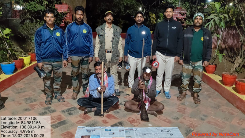 ଦେଶୀ ବନ୍ଧୁକ,ଗୁଳି, ଟାଙ୍ଗିଆ, ଟର୍ଚ୍ଚ ଲାଇଟ ଓ ଶିକାର ସରଞ୍ଜାମ ଜବତ, ଦୁଇ ଶିକାରୀ ଗିରଫ