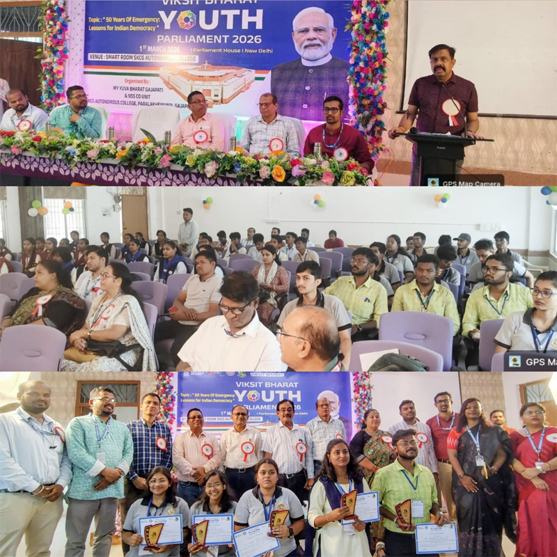 ପାରଳାଖେମୁଣ୍ଡି / ବାଳକୃଷ୍ଣ ପାଣିଗ୍ରାହୀ : ଗଜପତି ଜିଲ୍ଲା ସଦରମହକୁମା ପାରଳାଖେମୁଣ୍ଡି ସ୍ଥିତ ଶ୍ରୀ କୃଷ୍ଣଚନ୍ଦ୍ର ଗଜପତି ସ୍ୱୟଂଶାସିତ ମହାବିଦ୍ୟାଳୟରେ ଆଜି ( ରବିବାର) ମହାଆଡମ୍ବରରେ “ବିକଶିତ ଭାରତ ଯୁବ ସଂସଦ–୨୦୨୬” କାର୍ଯ୍ୟକ୍ରମ ଆୟୋଜିତ ହୋଇଯାଇଛି। ମହାବିଦ୍ୟାଳୟର ଅଧ୍ୟକ୍ଷ ପ୍ରଫେସର ରାଧାକାନ୍ତ ଭୂୟାଁଙ୍କ ସଭାପତିତ୍ୱରେ ଆୟୋଜିତ ଏହି ଅଧିବେଶନରେ ମୁଖ୍ୟଅତିଥି ଭାବେ ଗଜପତି ଜିଲ୍ଲା ଆରକ୍ଷୀ ଅଧୀକ୍ଷକ ଶ୍ରୀ ଯତୀନ୍ଦ୍ର ପଣ୍ଡା ଯୋଗଦେଇ ତାଙ୍କ ଅଭିଭାଷଣରେ ଯୁବସମାଜକୁ ସଚେତନ ନାଗରିକ ଭାବେ ଦେଶ ଓ ସମାଜ ପ୍ରତି କର୍ତ୍ତବ୍ୟ ସମ୍ପର୍କରେ ଅବଗତ କରାଇବା ସହ ଦେଶ ଗଠନରେ ଯୁବଶକ୍ତିର ମୂଲ୍ୟବାନ ଭୂମିକା ଉଲ୍ଲେଖ କରିଥିଲେ। ମହାବିଦ୍ୟାଳୟର ଆନ୍ତଃ ଗୁଣବତ୍ତା ଆଶ୍ୱାସନା ପ୍ରକୋଷ୍ଠର ନିର୍ଦ୍ଦେଶକ ଡ. ବିଘ୍ନେଶ୍ୱର ମିଶ୍ର ଯୁବ ସଂସଦର ଲକ୍ଷ୍ୟ ଓ ଉଦ୍ଦେଶ୍ୟ ବିଷୟରେ ଆଲୋକପାତ କରିଥିଲେ।