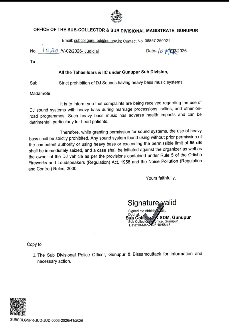 (ଗୁଣପୁର ରୁ ସନ୍ତୋଷ କୁମାର ସୁବୁଦ୍ଧି): ଅତ୍ୟଧିକ ଡିଜେ ସାଉଣ୍ଡ ଉପରେ ଗୁଣପୁର ଉପ ଜିଲ୍ଲାପାଳ ଦୁଧାଲ ଅଭିଷେକ ଦୀଲିପ ରୋକ ଲଗେଇଛନ୍ତି । ଆଜି ଉପ ଜିଲ୍ଲାପାଳଙ୍କ କାର୍ଯ୍ୟାଳୟରୁ ବିଧିବଦ୍ଧ ଭାବେ ପତ୍ର ସଂଖ୍ୟା ୧୦୨୦/୧୦-୦୩-୨୦୨୬ ପ୍ରକାରେ ଗୁଣପୁର ଉପଖଣ୍ଡରେ ୫୫ଡିବି ଠାରୁ ଅଧିକ ଶବ୍ଦରେ ବାଜୁଥିବା ଡିଜେ ଗୁଡିକୁ ସିଜ କରିବା ସହ ବ୍ୟବହାର କରୁଥିବା ବ୍ୟକ୍ତି, ଅନୁଷ୍ଠାନ ମୁଖ୍ୟଙ୍କୁ ଗିରଫ କରିବା ସହ ଡିଜେ ଗାଡି ସିଜ କରିବା ନିମନ୍ତେ ଉପ ଜିଲ୍ଲାପାଳ ଆଦେଶ ଦେଇଛନ୍ତି । ବିଭିନ୍ନ ସମୟରେ ଅଭିଯୋଗ ଗୁଡିକ ପାଉଥିବାରୁ ଉପ ଜିଲ୍ଲାପାଳ ଦୃଢ଼ ପଦକ୍ଷେପ ଗ୍ରହଣ କରିବାକୁ ତହସିଲଦାର ଓ ଥାନା ଅଧିକାରୀ ମାନଙ୍କୁ ନିର୍ଦ୍ଦେଶ ଦେଇଛନ୍ତି । ବିବାହ, ଶୋଭାଯାତ୍ରାରେ ଓ ରାସ୍ତା ଉପରେ ଡ଼ିଜେ ଗୁଡିକ ବହୁମାତ୍ରାରେ ଶବ୍ଦ କରୁଥିବାରୁ ସେଗୁଡିକୁ ରୋକ ଲଗେଇବା ସହ ଆଇନ ଅନୁଯାୟୀ ଡିଜେ ଗାଡି ବ୍ୟବହାର କରିବାକୁ ଉପ ଜିଲ୍ଲାପାଳ ନିର୍ଦ୍ଦେଶ ଦେଇଛନ୍ତି ।