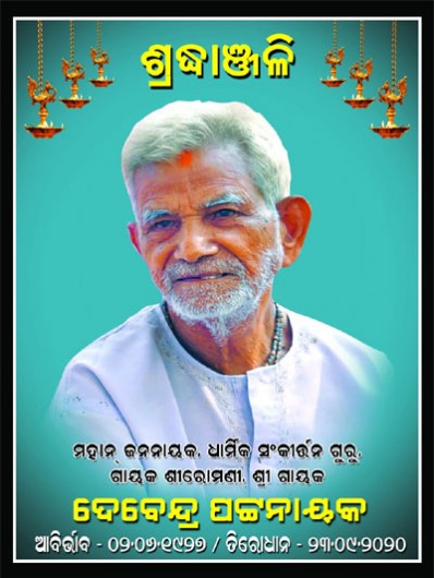 ପାରଳାଖେମୁଣ୍ଡି / ବାଳକୃଷ୍ଣ ପାଣିଗ୍ରାହୀ : ମହାନ ଜନନାୟକ , ଧାର୍ମିକ ସଂକୀର୍ତ୍ତନ ଗୁରୁ , ଗାୟକ ଶୀରୋମଣୀ , ଶ୍ରୀ ଗାୟକ ଦେବେନ୍ଦ୍ର ପଟ୍ଟନାୟକଙ୍କ ୯୩ ବର୍ଷ ବୟସରେ ବୁଧବାର ଦିନ ପରଲୋକ ହୋଇଯାଇଛି । ୧୯୨୭ ମସିହା ଜୁନ୍ ମାସ ୨ ତାରିଖରେ ଜନ୍ମଗ୍ରହଣ କରିଥିଲେ। ସେ ଜଣେ ମିଷ୍ଟ ଭାଷୀ ଶାନ୍ତ ସରଳ ମେଳାପୀ ବ୍ୟକ୍ତିଭାବେ ସେ ସର୍ବତ୍ର ପରିଚିତ ଥିଲେ । ସେ ଜଣେ ବିଶିଷ୍ଠ ମୃଦଙ୍ଗ ବାଦକ , ଗାୟକ ଭାବେ ପାରଳାଖେମୁଣ୍ଡି ସହର ସମେତ ଆଖପାଖ ଅଞ୍ଚଳରେ ବେସ ଜଣା ଶୁଣାଥିଲେ । ଅଷ୍ଟ ପ୍ରହର ନାମ ଯଜ୍ଞ, ଗୀତା ପାରାୟଣ ଇତ୍ୟାଦି ବିଭିନ୍ନ ଧାର୍ମିକ କାର୍ଯ୍ୟରେ ମୃଦଙ୍ଗ ବଜାଇବା ସହ ନାମସଂକୀର୍ତ୍ତନ କରି ବେସ ପରିଚିତ ଥିଲେ । ନିତ୍ୟାନନ୍ଦ ପାଠାଗାରର ମୁଖ୍ୟ ଉପଦେଷ୍ଟା ସହ ସେ ବିଭିନ୍ନ ଅନୁଷ୍ଠାନ ତରଫରୁ ସମ୍ମାନ ଓ ମାନପତ୍ର ପାଇଥିଲେ ।